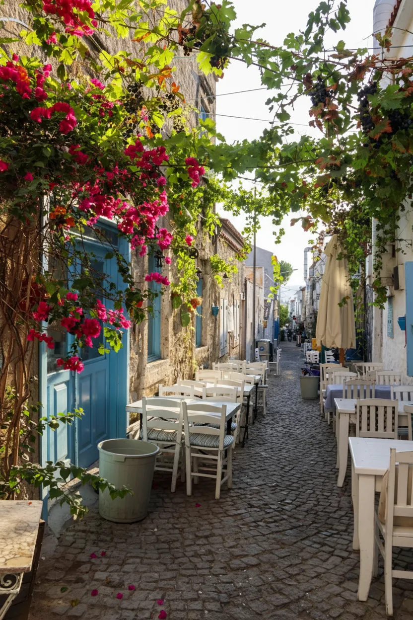 shops. The area reflects a blend of Aegean culture, historic architecture, and