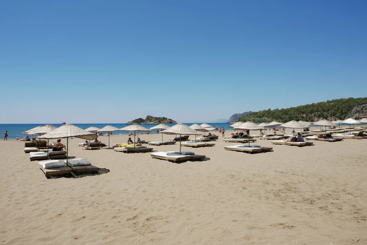 Province, Turkey. The beach is known for its soft golden sand, crystal-clear