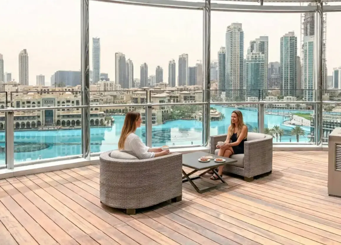 - 6:30 PM – Fountain View ⛲🎶: Watch the Dubai Fountain show from your room 🤩🌃