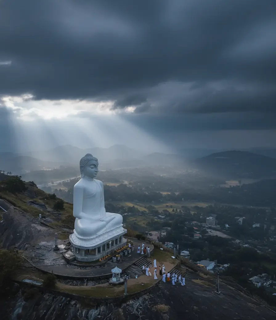 majestic white Buddha statue, watching peacefully over the city and lake below.