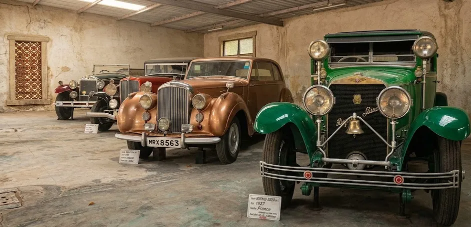 showcases royal cars, luxury models, convertibles, motorbikes, and historic