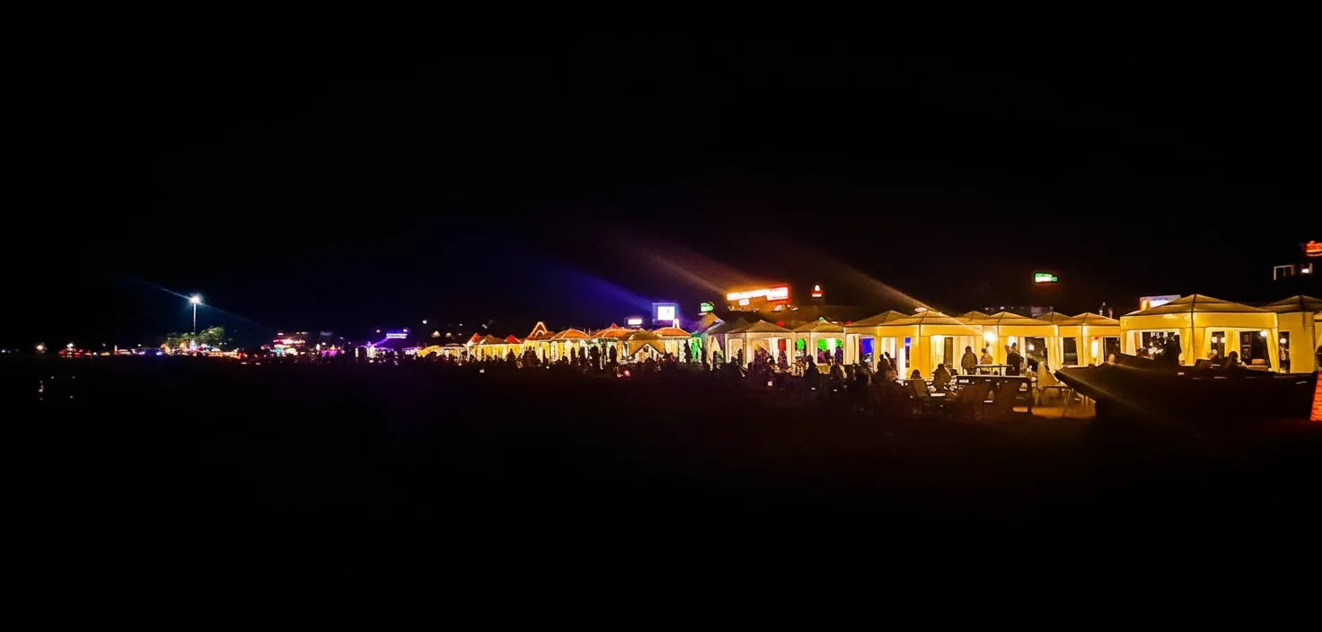 along the coastline. The beach area includes restaurants, bars, markets, and