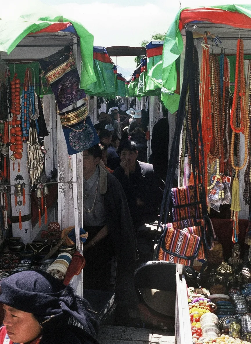 • 👗 Browse traditional 🧿 Tibetan clothing and jewelry displayed in vibrant market stalls ✨