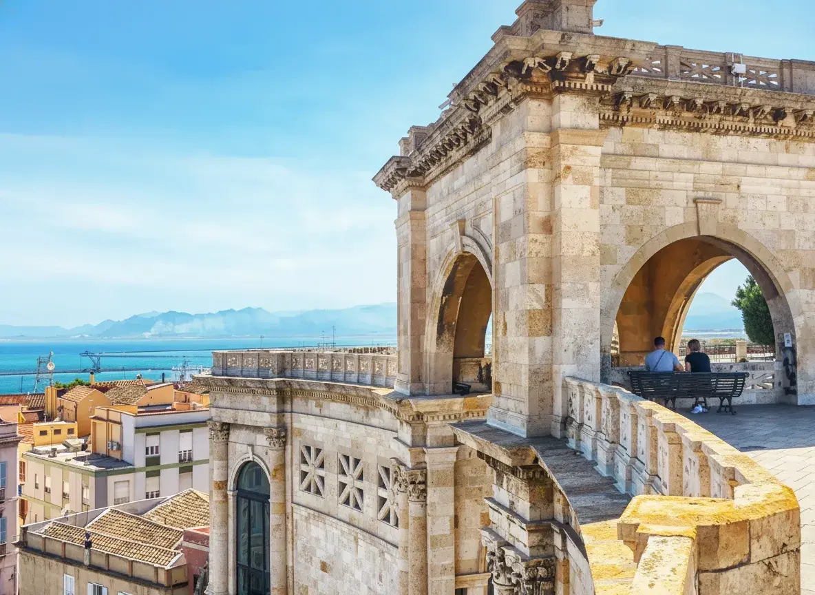 Cagliari, and the distant hills. Built in the late 19th century, the bastion connects the upper and lower