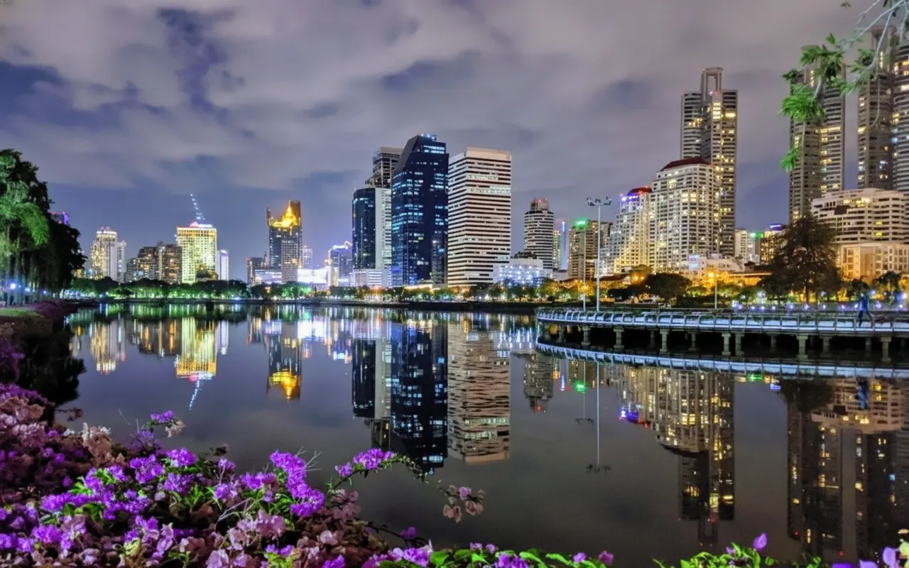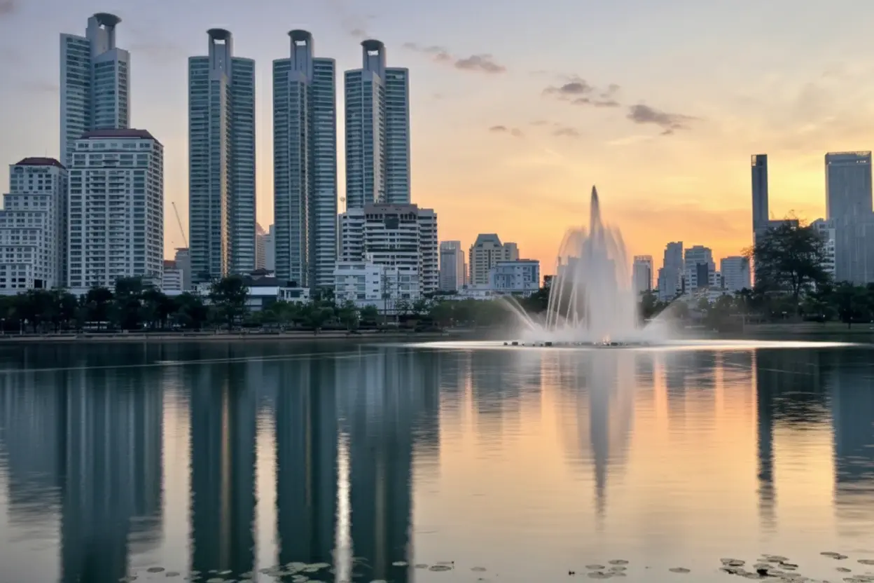 surrounded by water and city views. Located near Asok and Sukhumvit, the park is built around a
