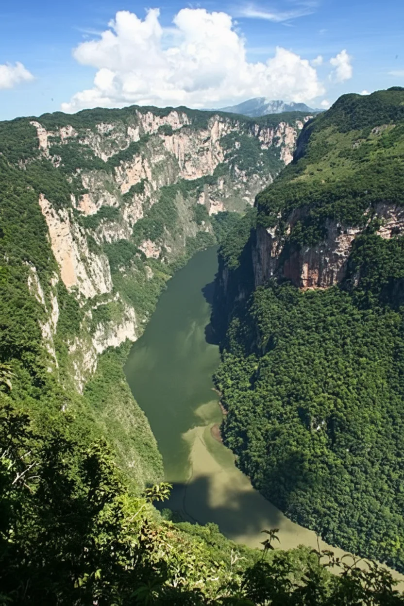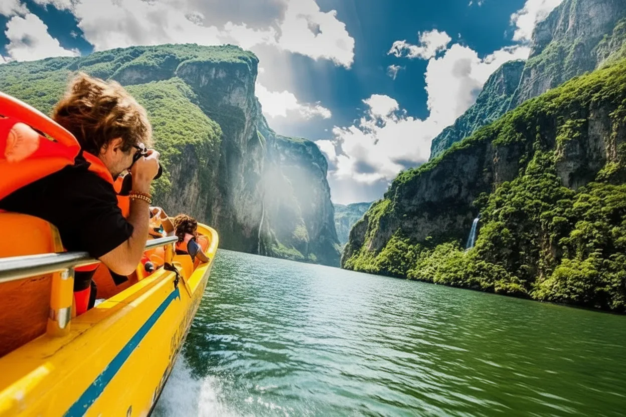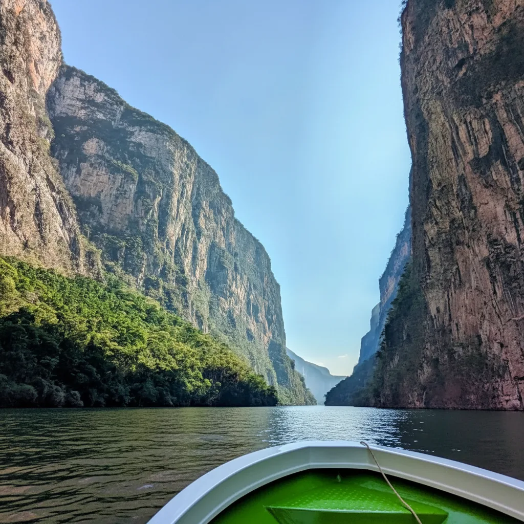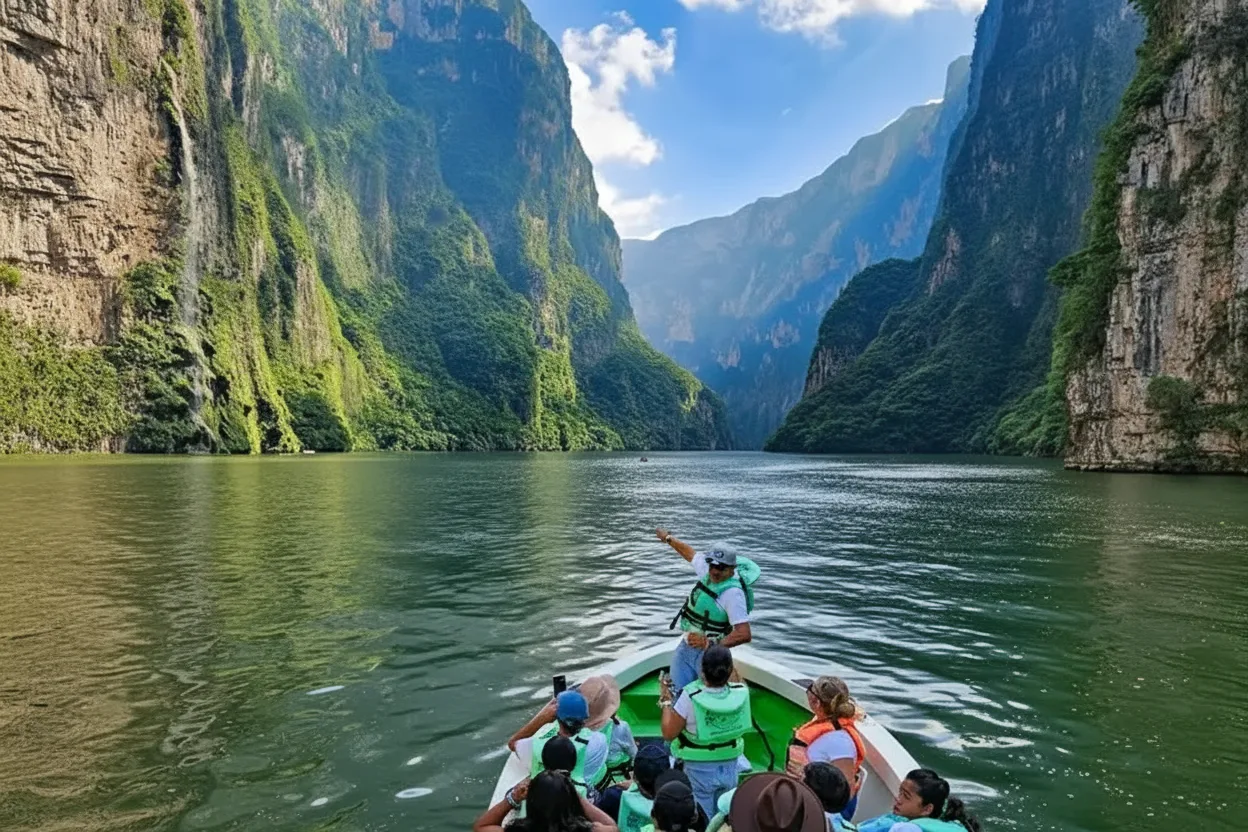 • 🚤 Board a guided 🌊 river tour to explore the 🏔️ towering walls of Sumidero Canyon 🦅