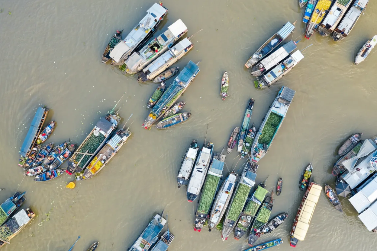 boats gathering to trade fruits, vegetables, and daily goods directly on the water.