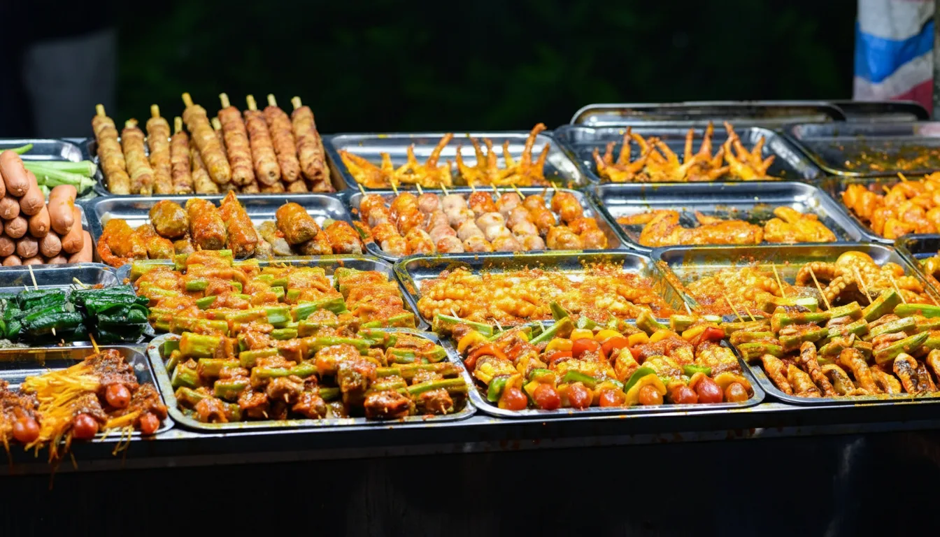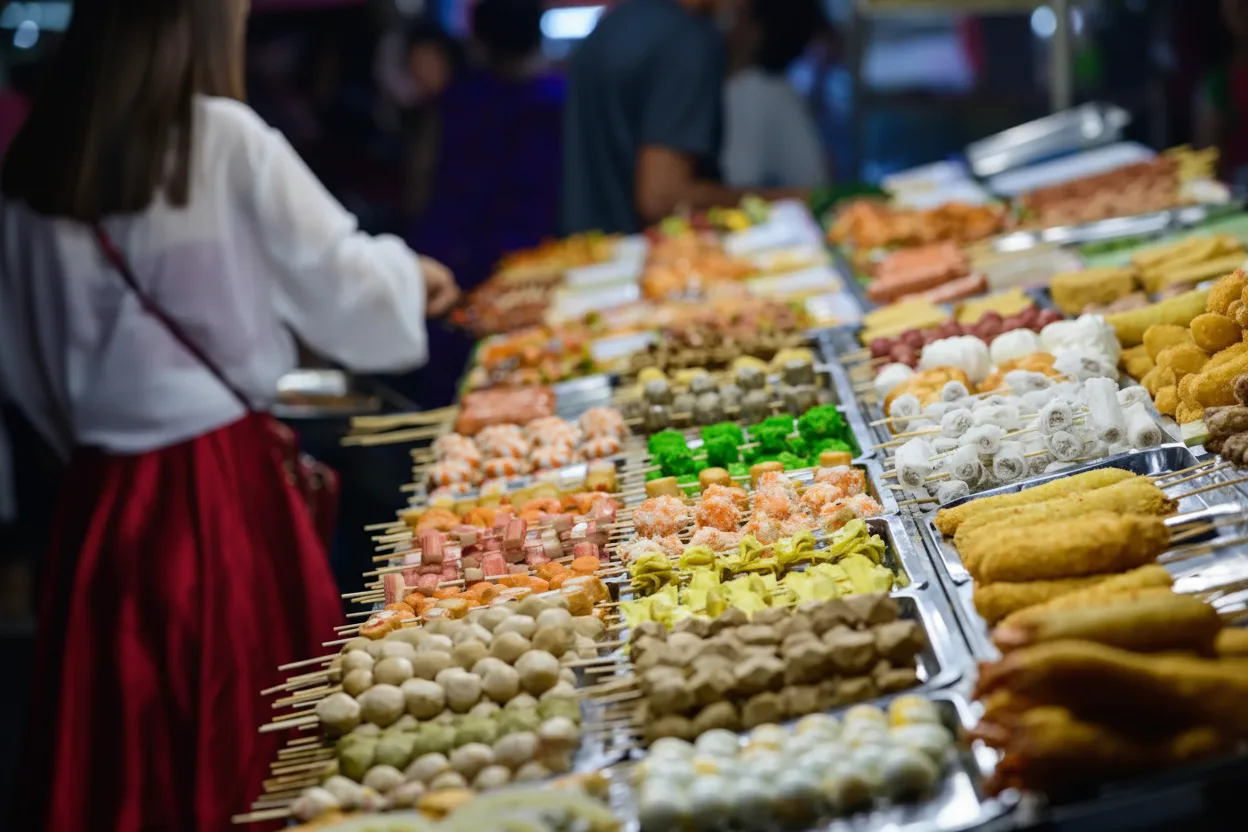 colorful lights, food stalls, and friendly vendors.