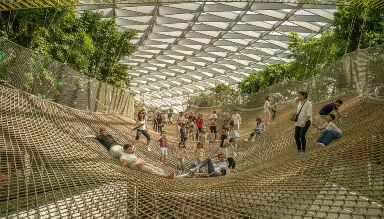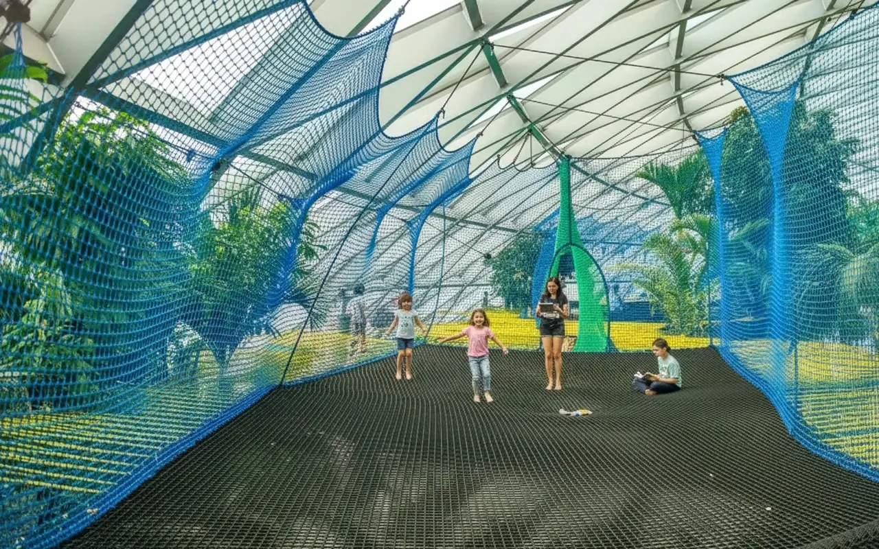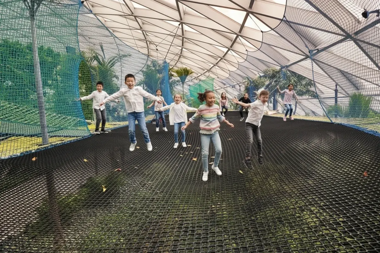 walking trails, floral displays, sky nets, mazes, and interactive play areas for both kids and