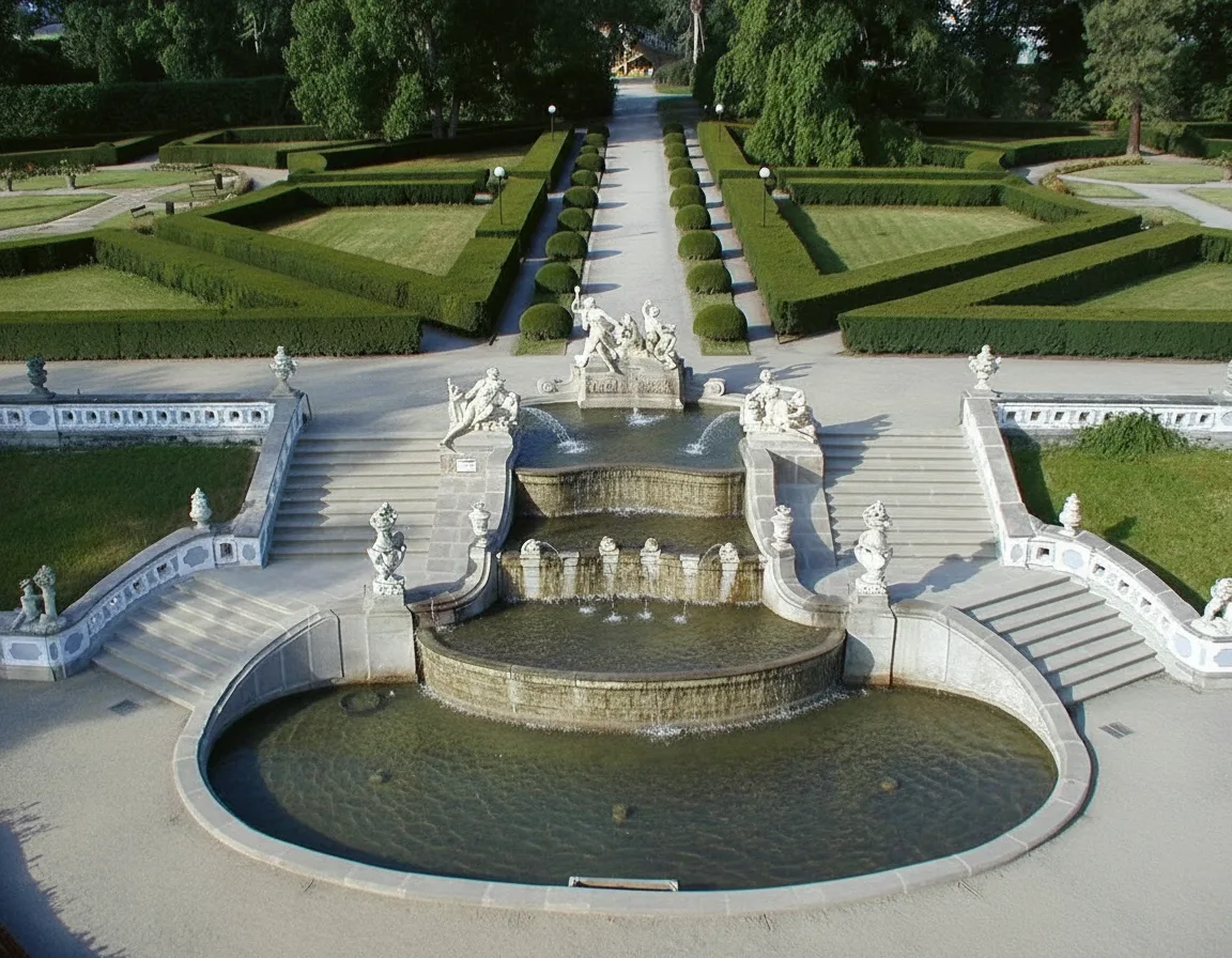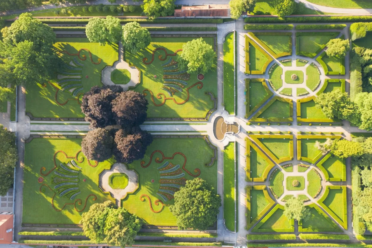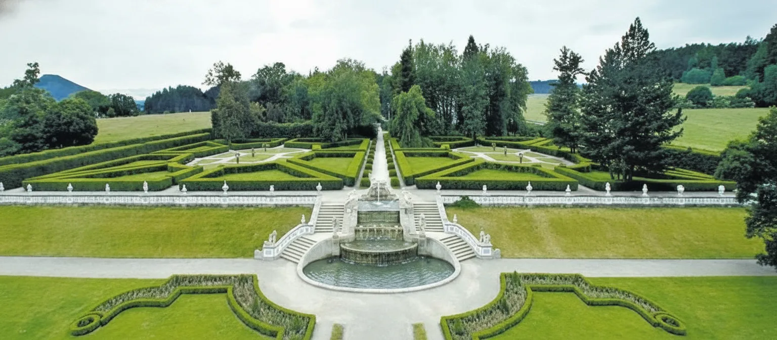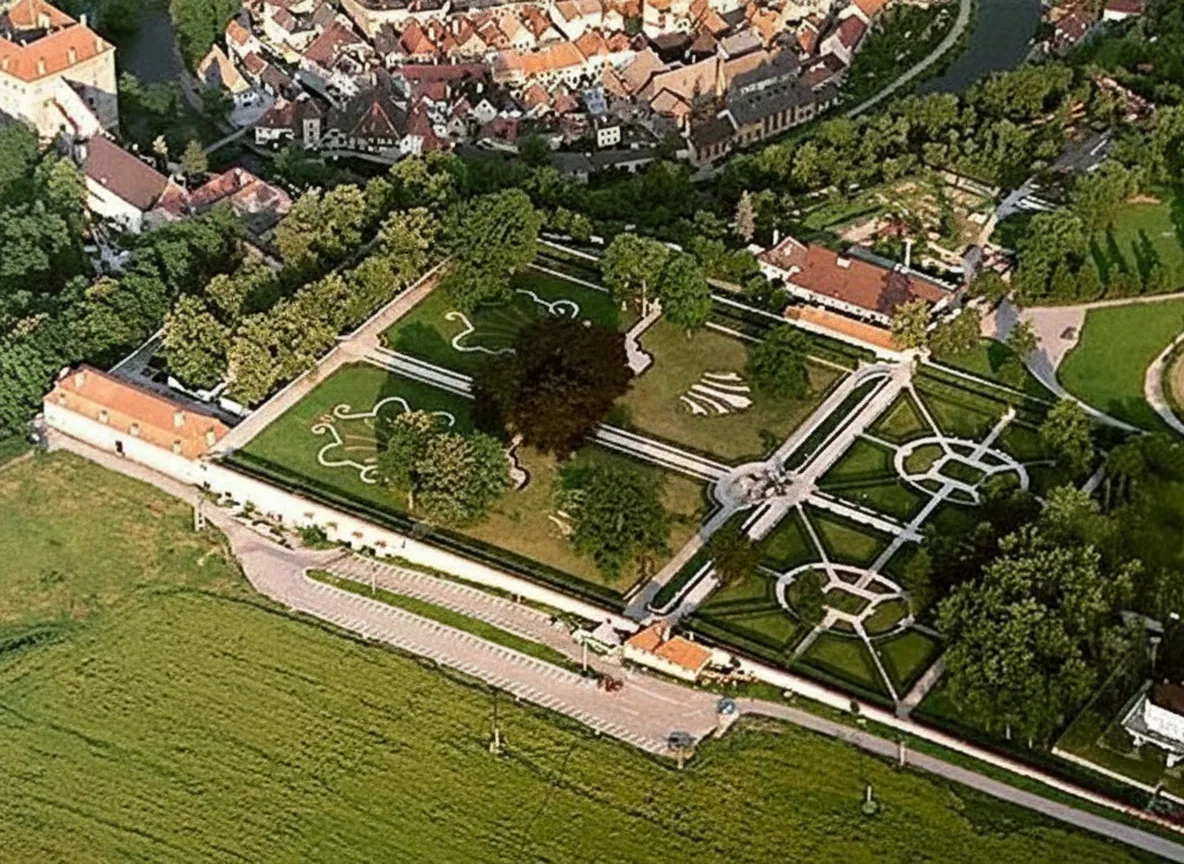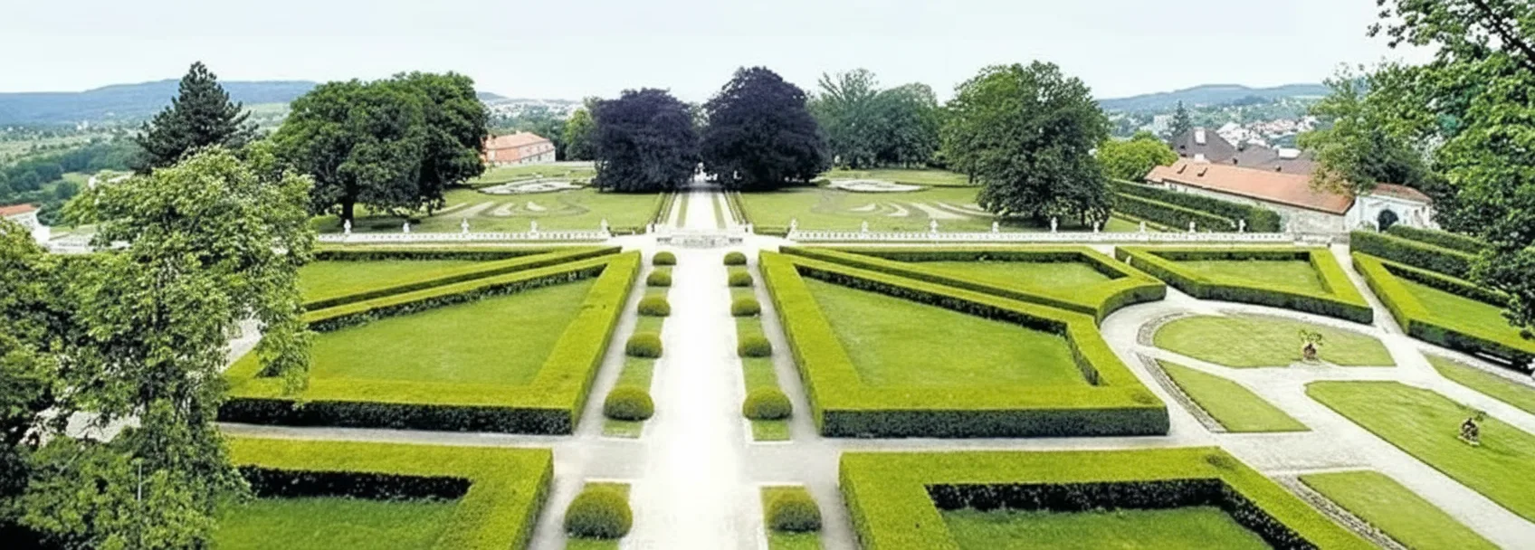 Czechia. Designed in a formal Baroque style, the gardens offer open lawns, pathways, and scenic