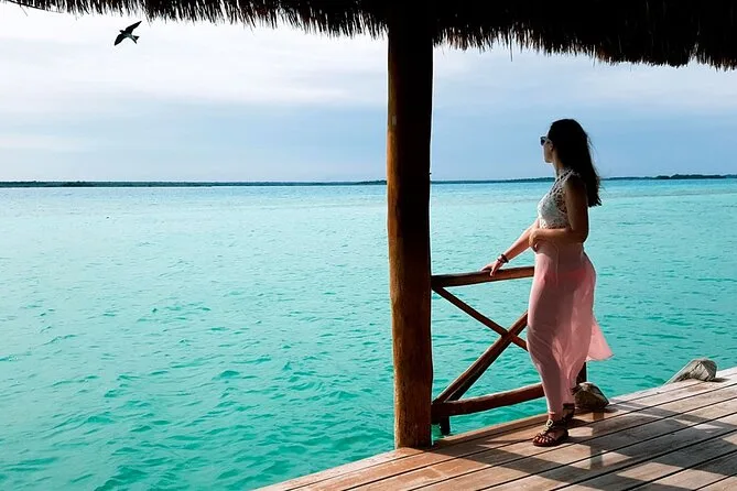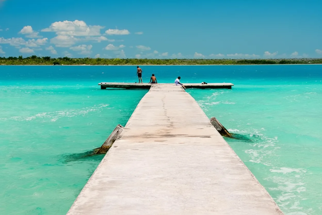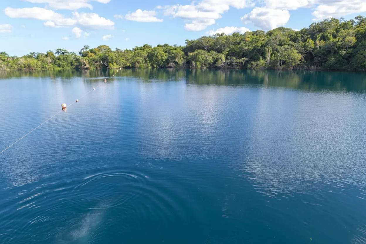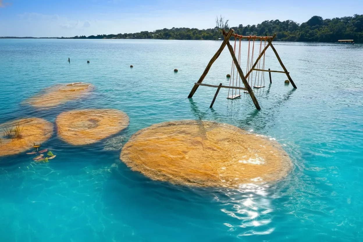 Cenote Azul is one of the largest and deepest open cenotes near Bacalar, Mexico. Unlike cave cenotes, this natural sinkhole is open to the sky and surrounded by lush greenery. Its deep blue water and calm atmosphere make it a popular spot for swimming and relaxing. The cenote is ideal for travelers who enjoy freshwater swimming in a natural setting. Wooden platforms and easy access points allow visitors to enjoy the water safely while admiring the surroundings.