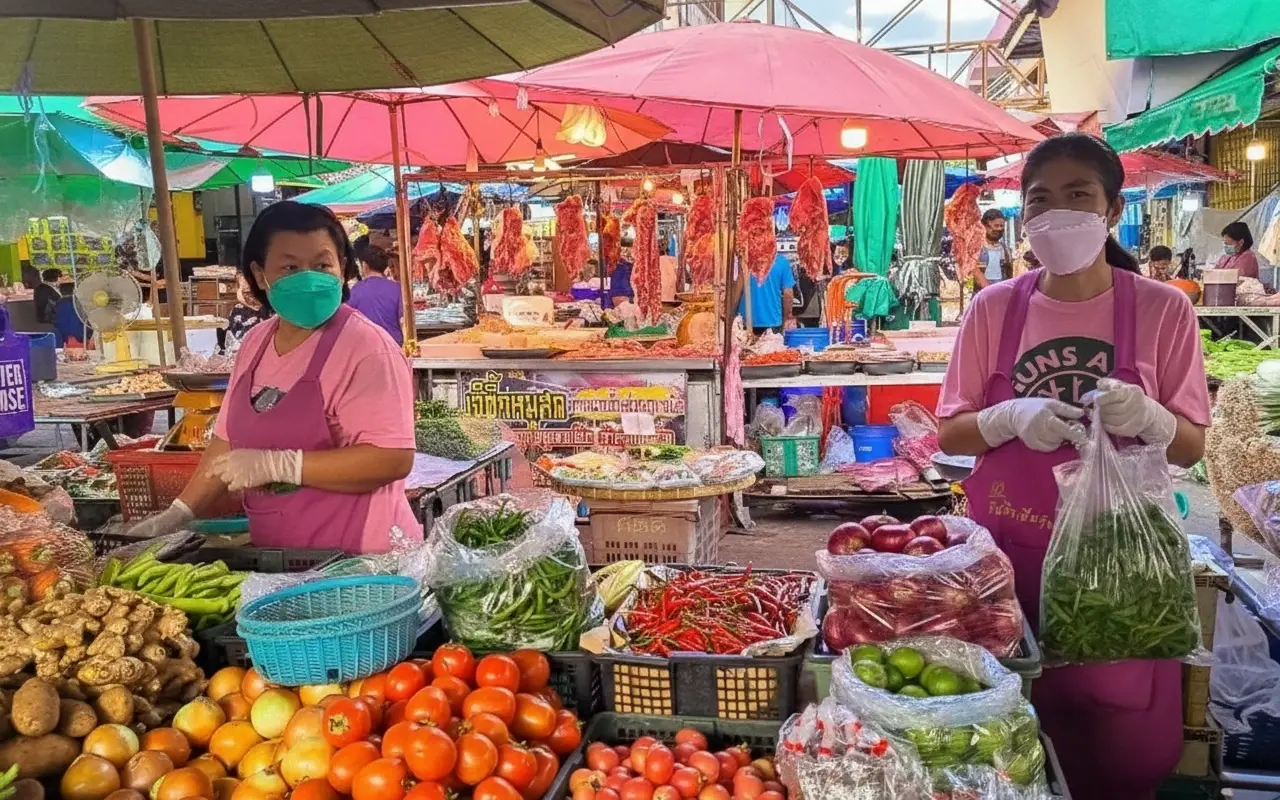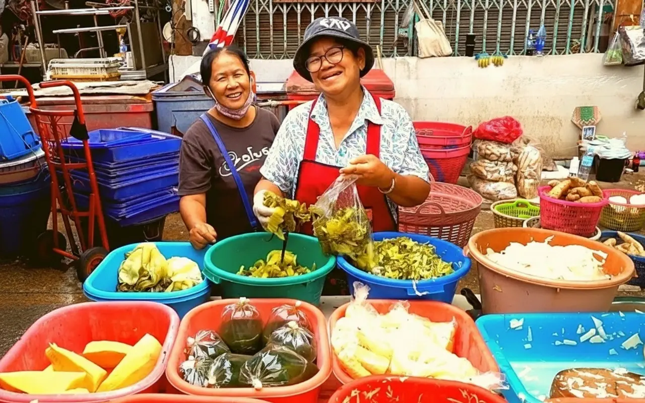 • Browse through stalls 🛍️ selling fruits 🍎, vegetables 🥕, and local Thai delicacies 🌶️😋