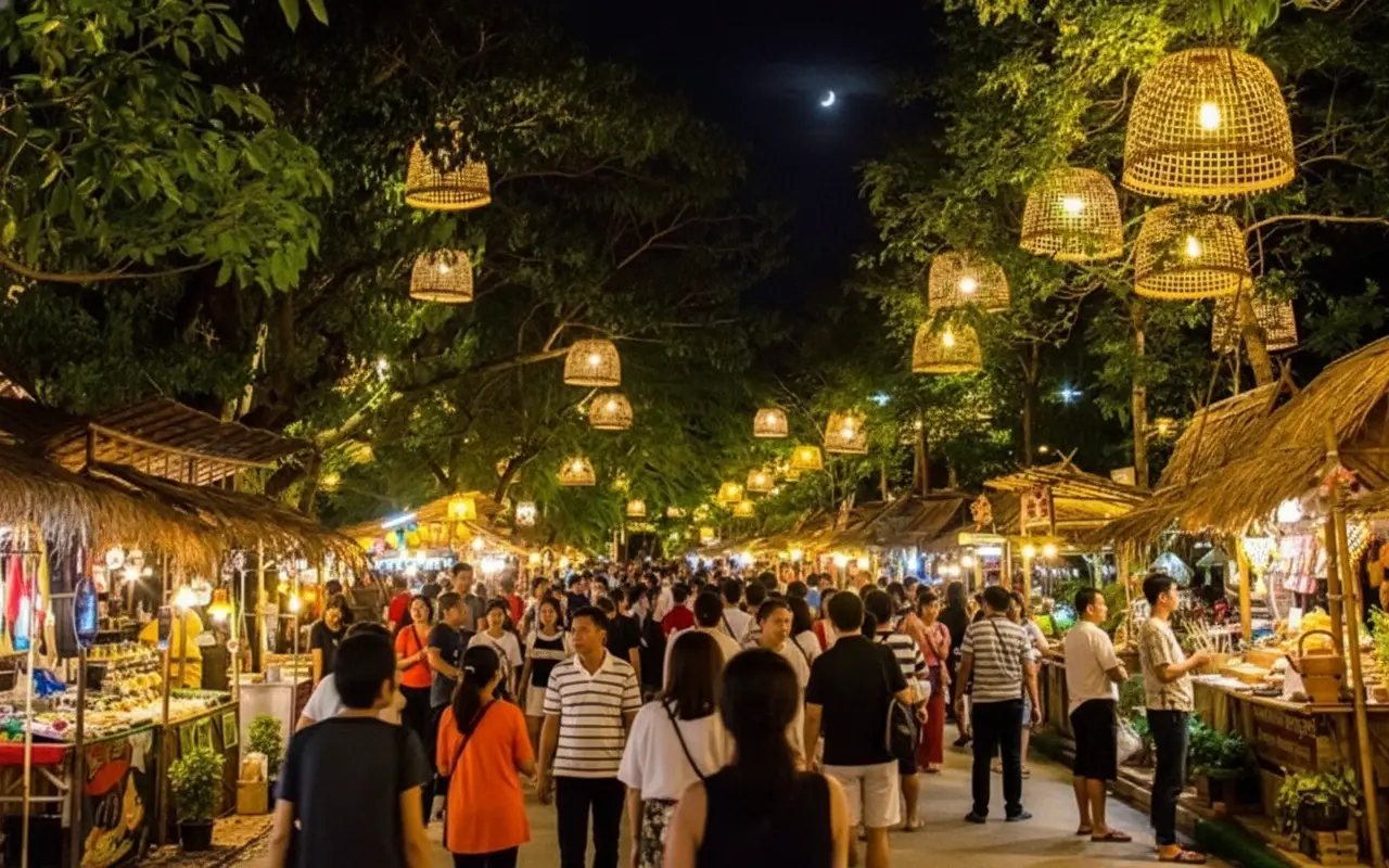 Early morning for fresh market goods or late afternoon for street food.