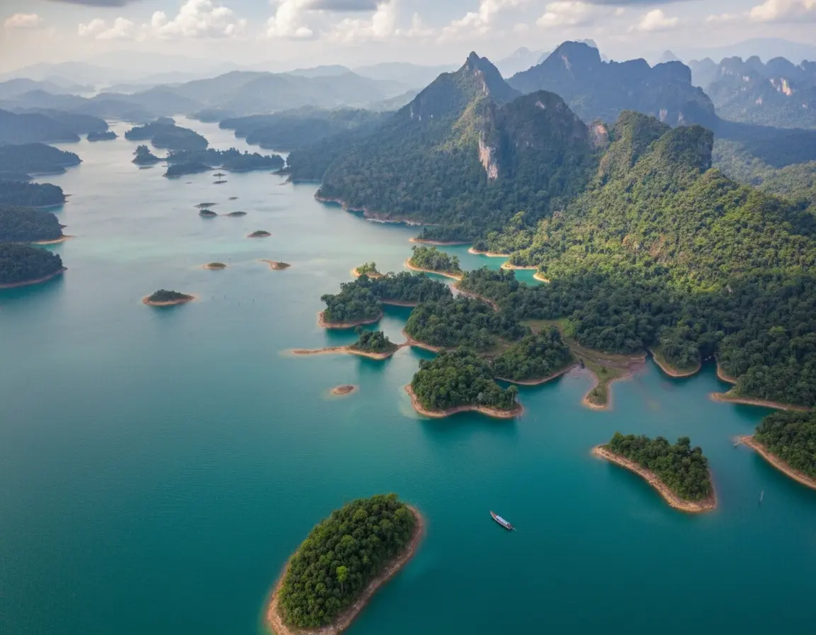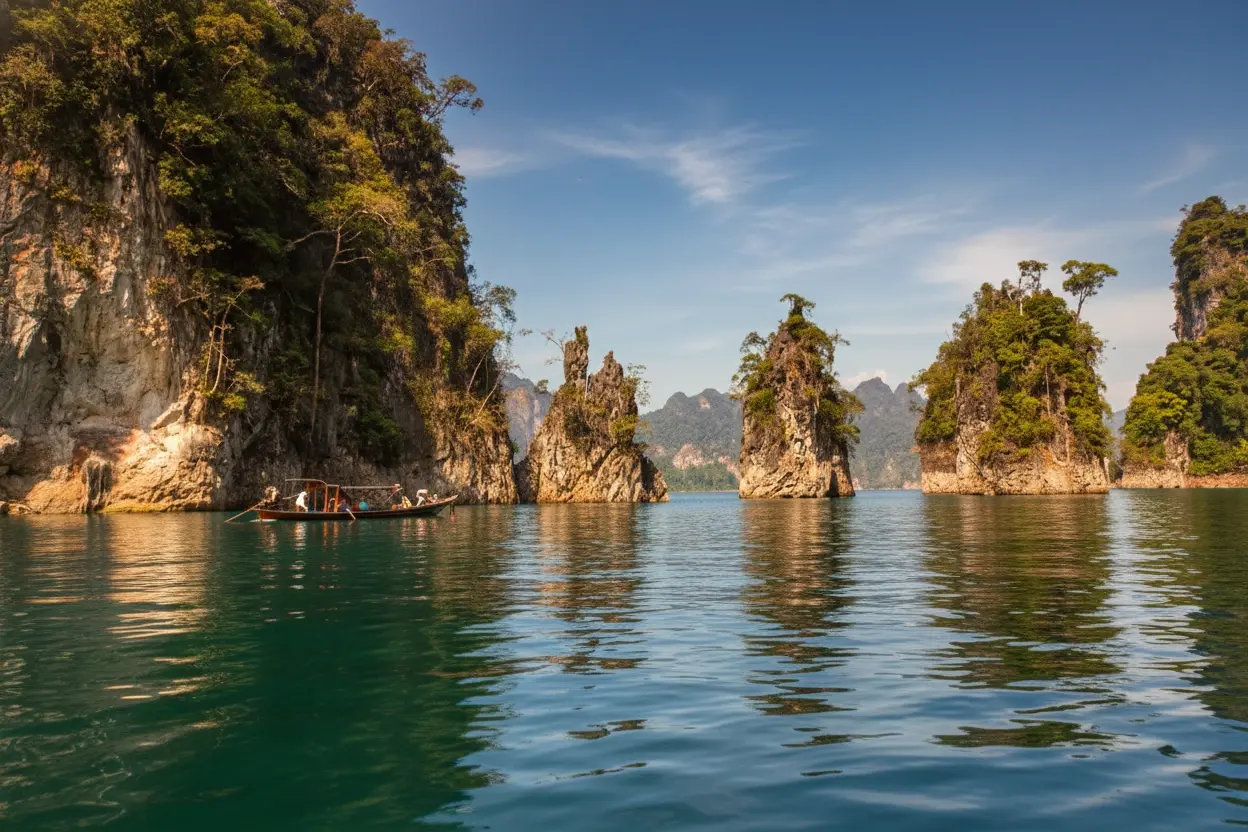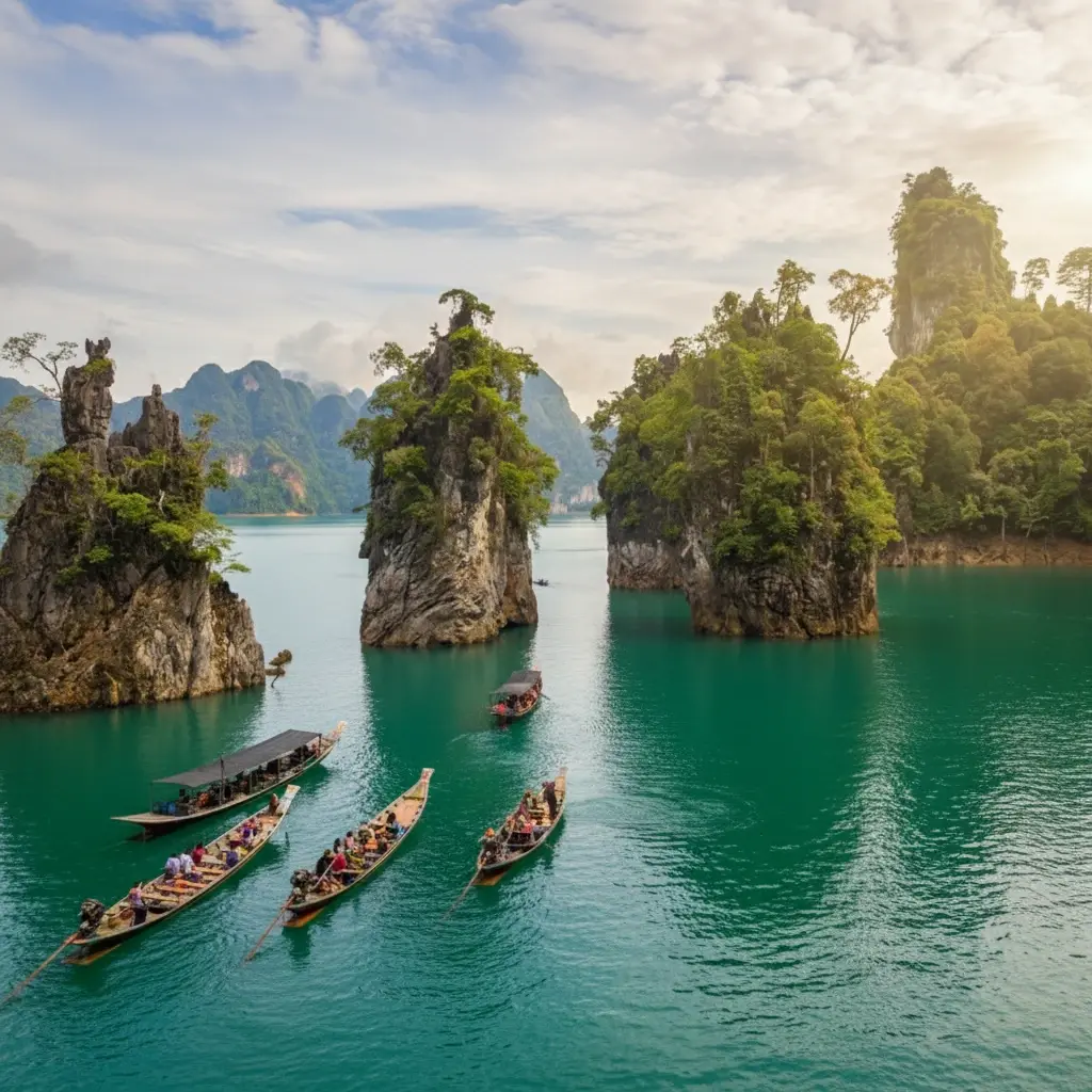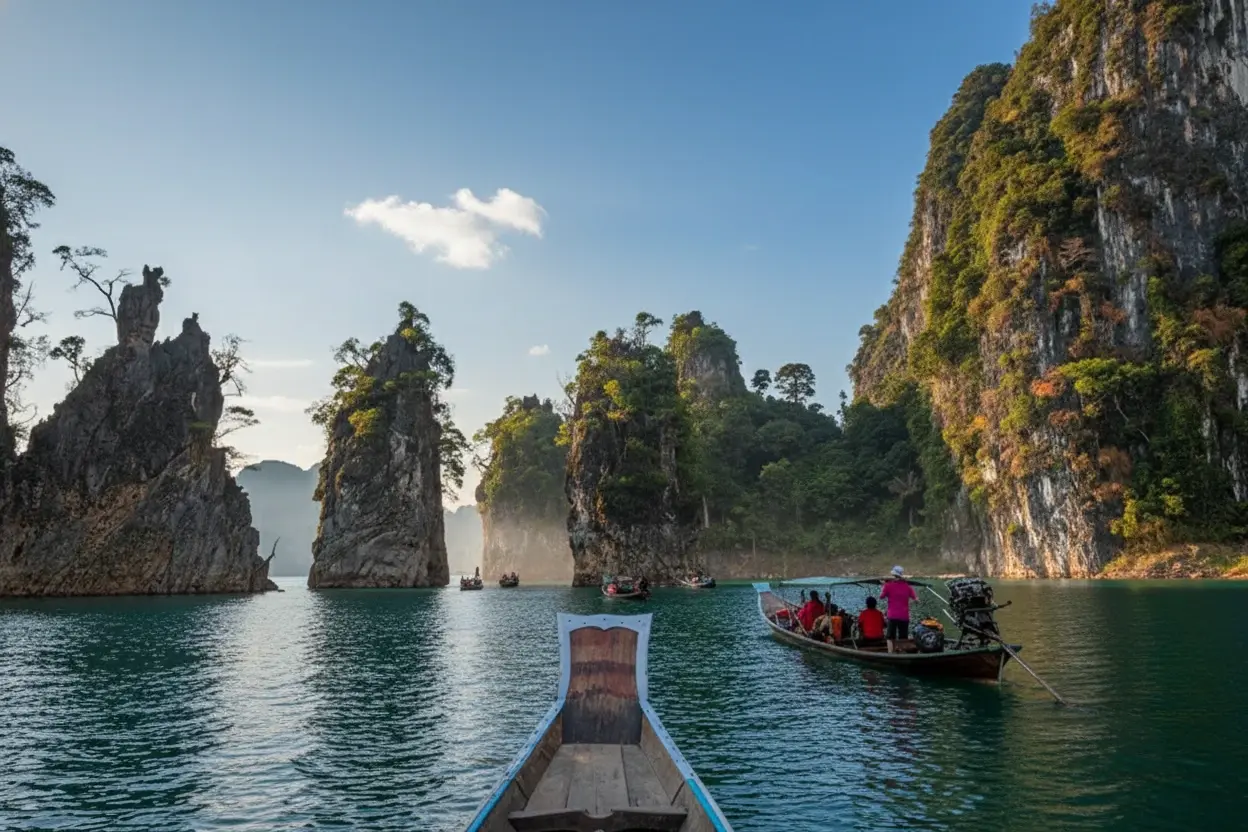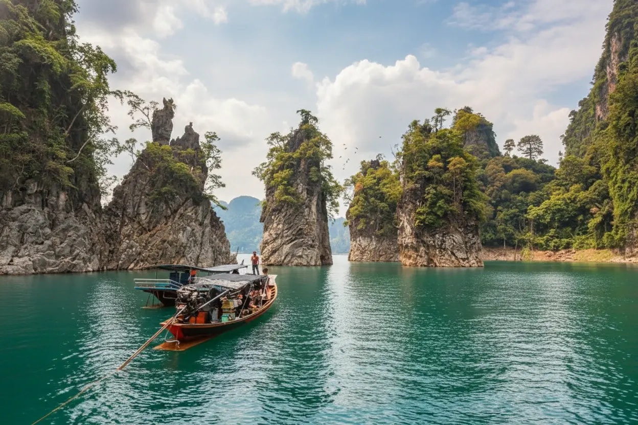 - 9:30 AM – Arrive 🧭 at Ratchaprapha Dam Pier ⚓ and start a boat tour 🚢🛶