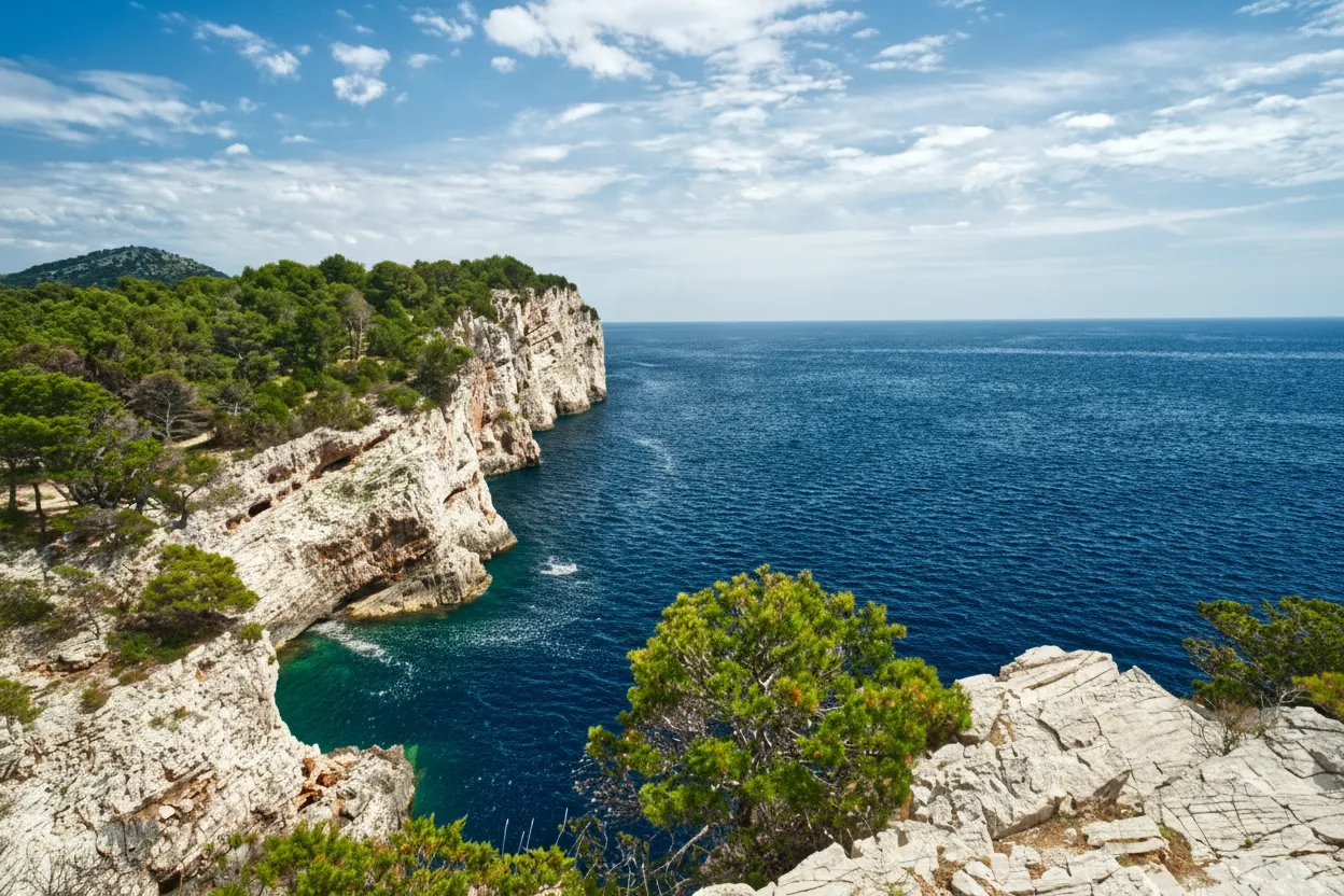 Cliff viewpoints in Kornati National Park offer some of the most dramatic sea views in the Adriatic. Steep rock faces rise sharply above deep blue waters, creating striking contrasts between land and sea. These viewpoints allow visitors to observe the vastness of the open sea and the rugged nature of the islands. They are especially popular with photographers and travelers who appreciate powerful coastal landscapes. For travelers, cliff viewpoints provide unforgettable visual moments and a strong sense of Kornati’s wild character.