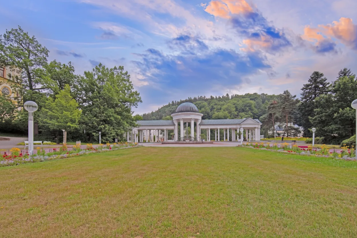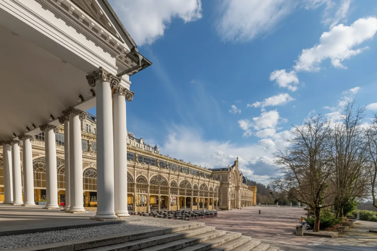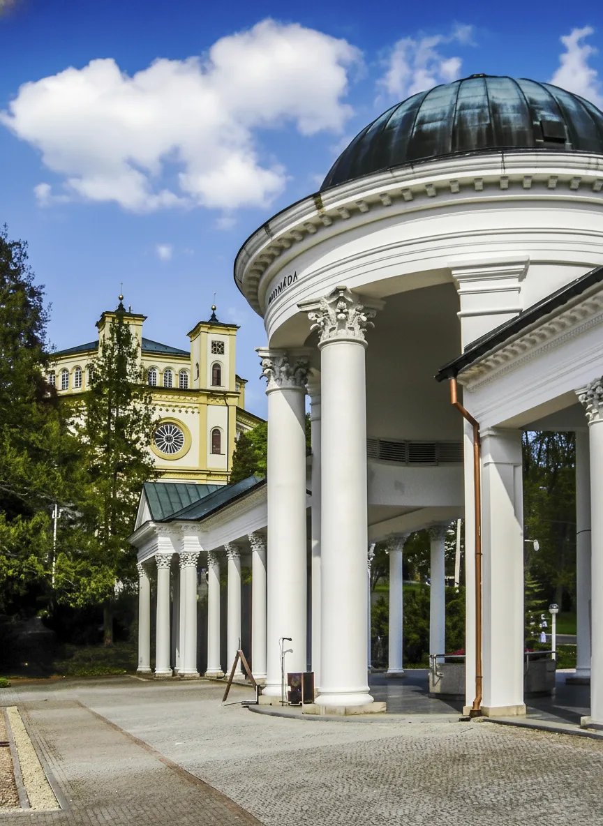 The Colonnade of the Singing Fountain is the most famous landmark of Mariánské Lázně, a historic spa town in western Czechia. The elegant colonnade surrounds the Singing Fountain and serves as a central meeting place for visitors. Its architecture and open design reflect the town’s long spa tradition. For travelers, this area offers a relaxing atmosphere and a glimpse into classic European spa culture.
