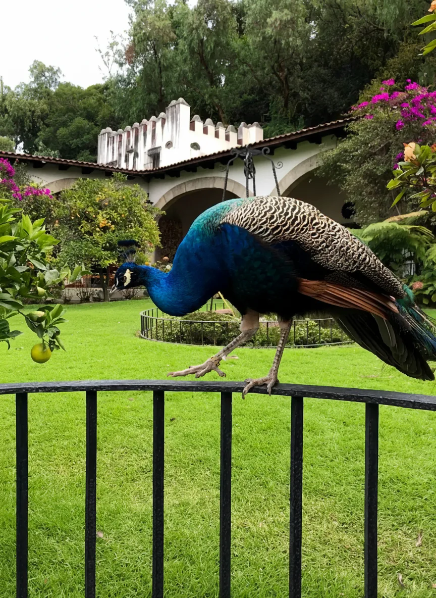 • 🦚 Walk through the expansive 🌿 landscaped gardens filled with peacocks and Xolo dogs 🐕