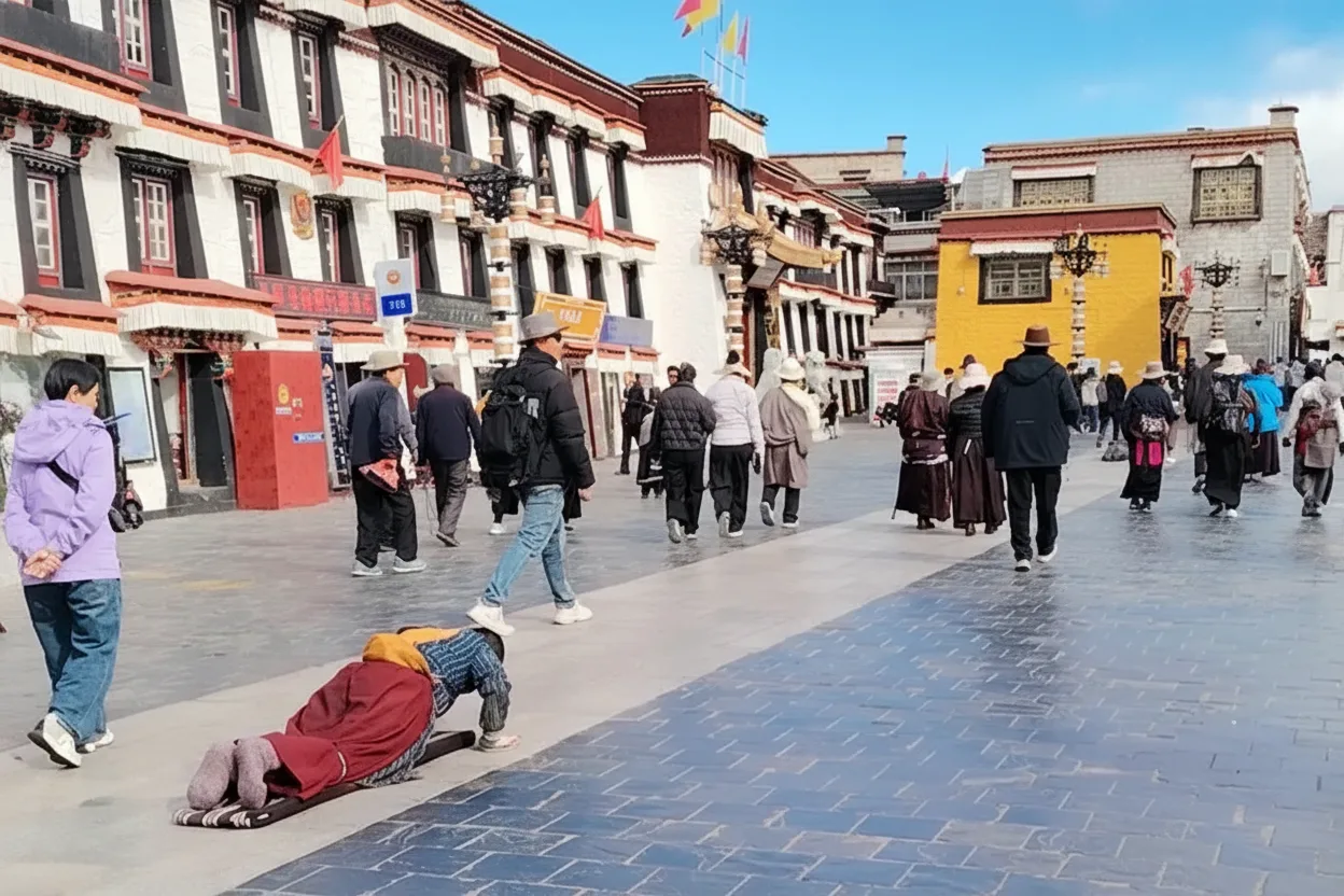 - 🙏 Watch devoted pilgrims performing full-body 🕉️ prostrations along the sacred Barkhor path ✨