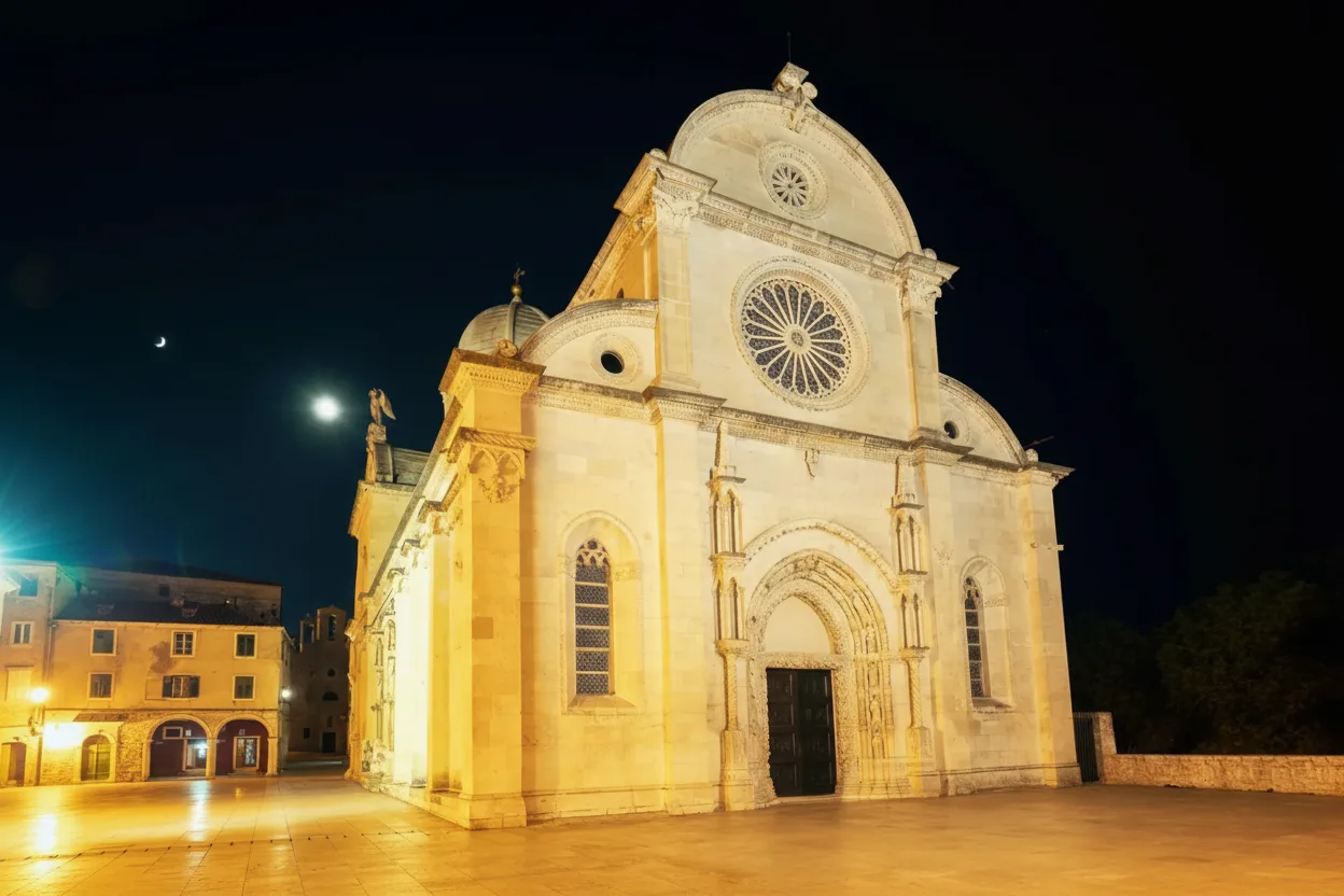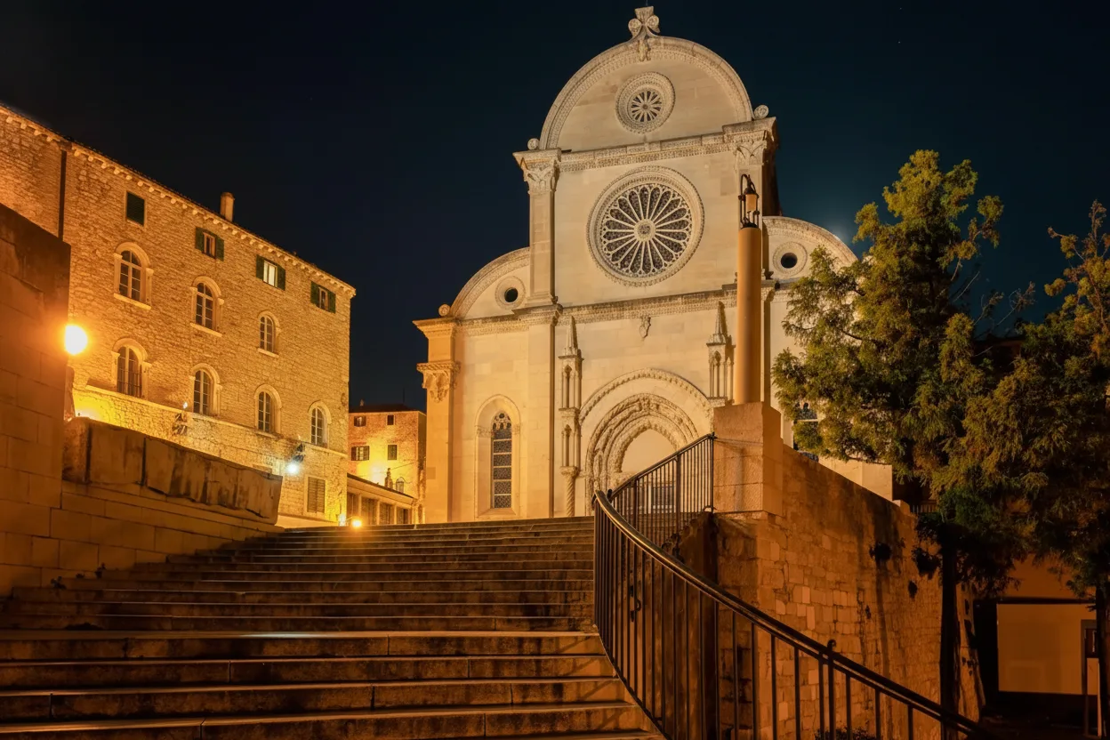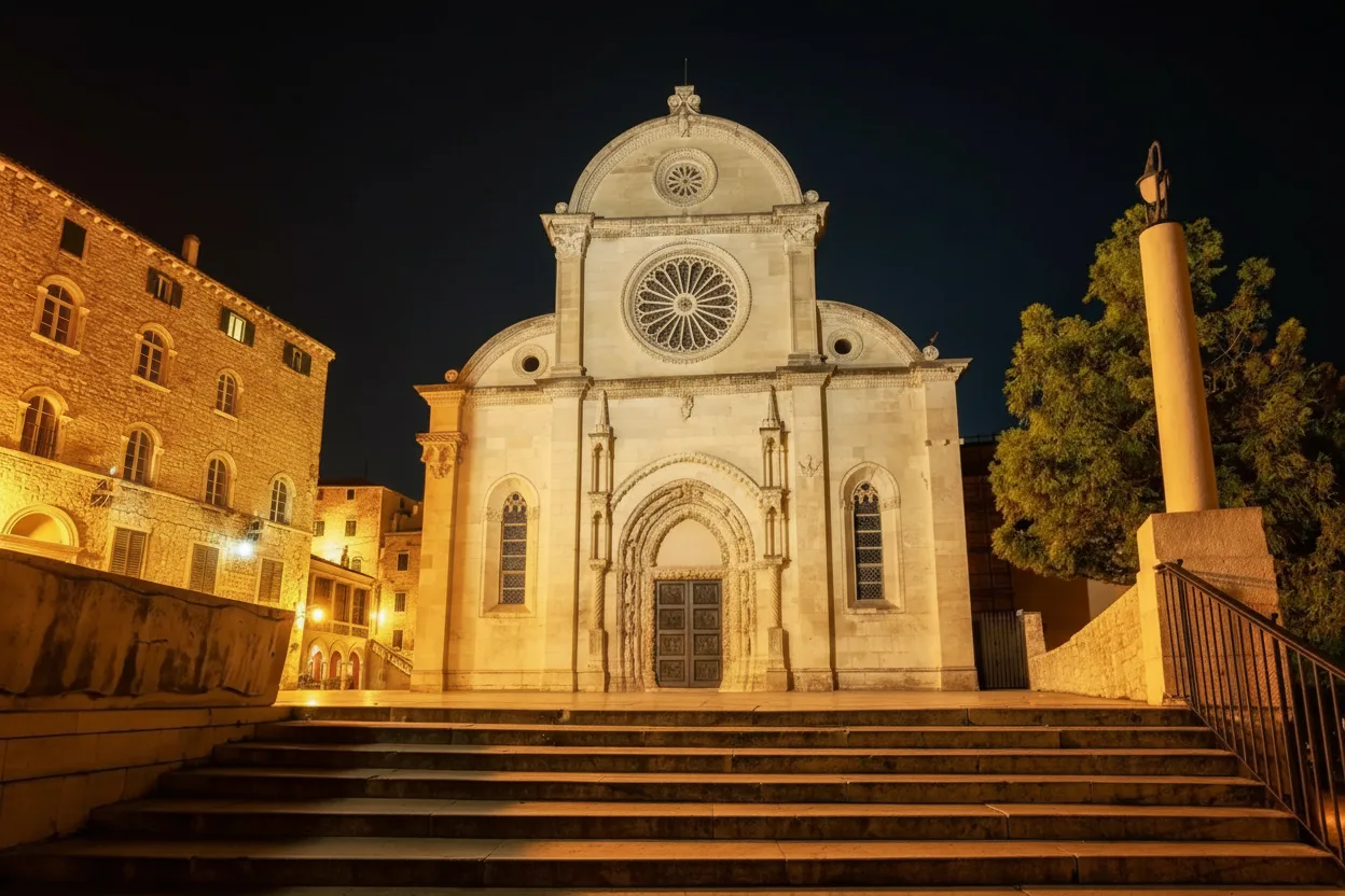 • ⛪ Admire the illuminated St. James Cathedral, a UNESCO masterpiece built entirely of stone 🏛️