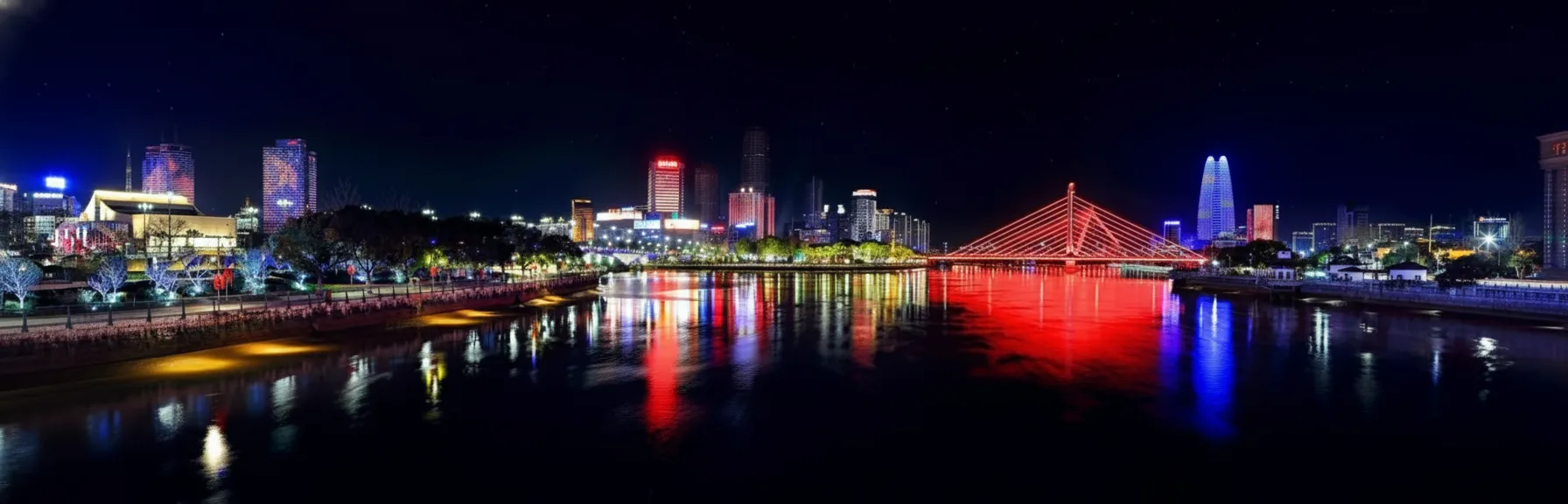 📌Evening waterfront areas, Ningbo city districts, Zhejiang Province, China