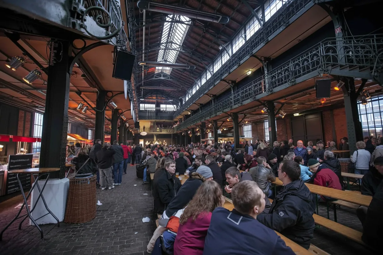• 🎸 Enjoy the energetic live music 🎤 inside the magnificent market hall 🏛️