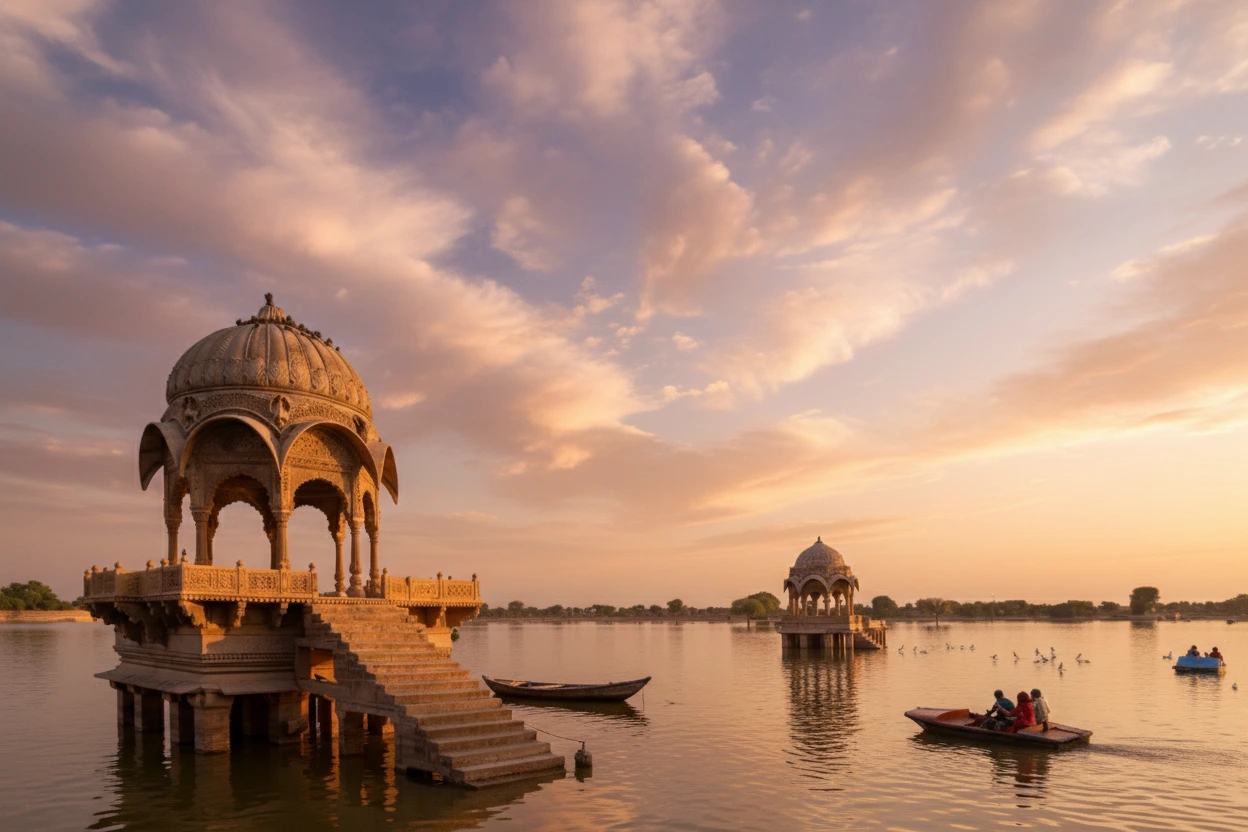 Gadisar Lake is a historic man-made reservoir located just outside Jaisalmer city, Rajasthan. Originally built to supply water to the desert town, the lake has become one of the most scenic and peaceful attractions in the region.