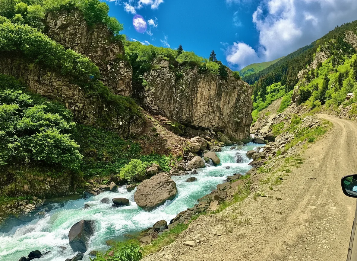 • 🛣️ Road follows the river 🌊 valley 🏔️