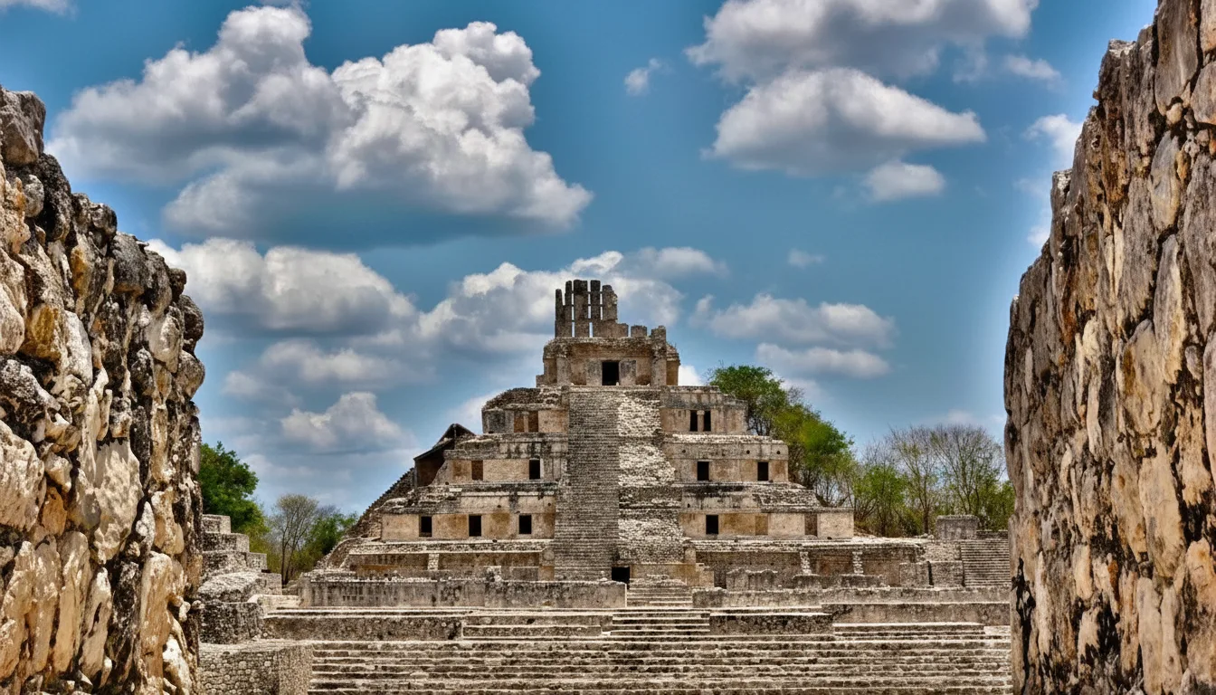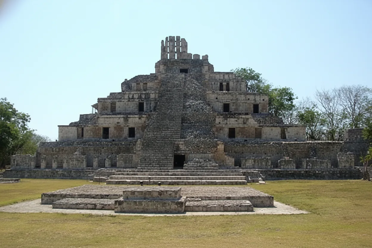 The Great Acropolis is the main ceremonial and administrative center of the ancient Maya city of Edzná, located in Campeche, Mexico. This large elevated complex contains multiple structures arranged around open courtyards, reflecting the political and religious importance of the site