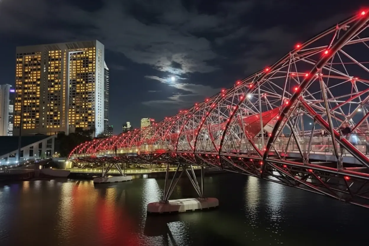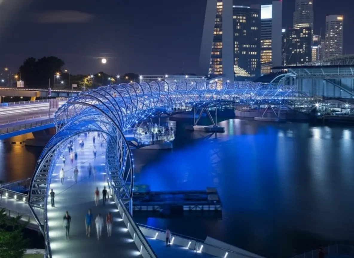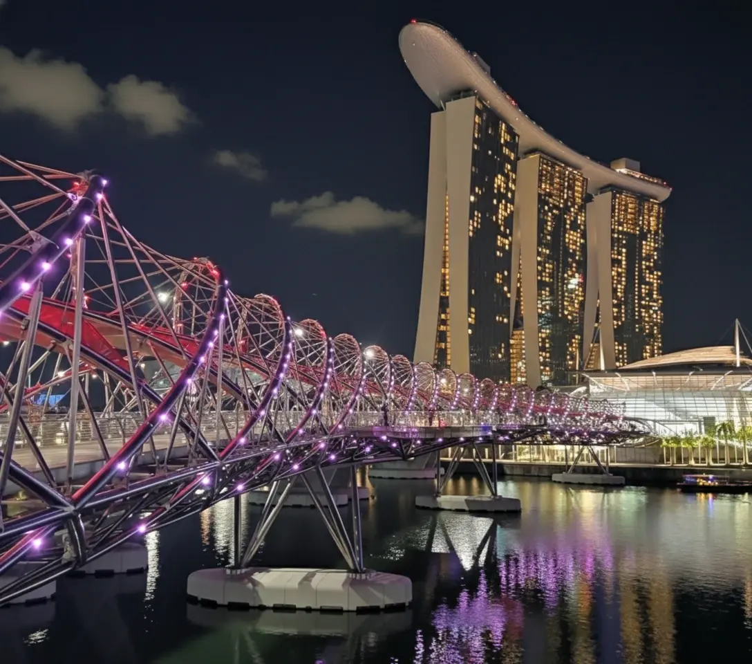 The Helix Bridge is one of Singapore’s most stunning architectural landmarks, designed to resemble the structure of human DNA. Spanning across Marina Bay, it connects Marina Centre with Marina South and provides pedestrians with breathtaking views of the city skyline. This award-winning pedestrian bridge is especially famous for its illuminated design, which creates a mesmerizing night-time spectacle.