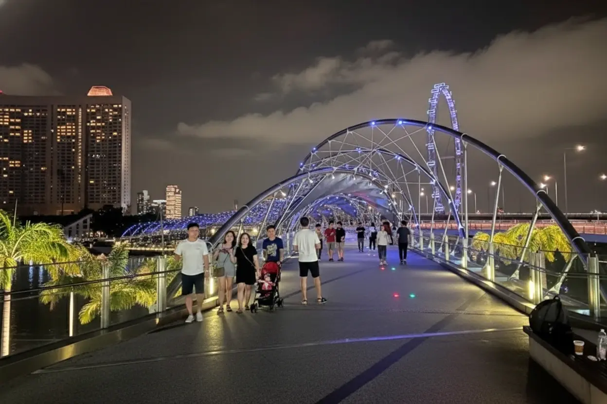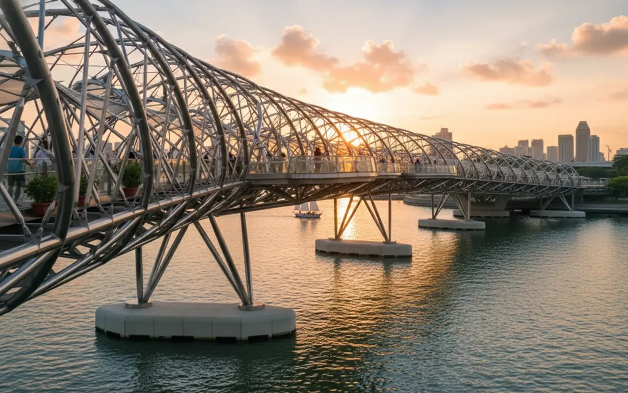• 7:00 PM – Cross Helix Bridge 🌉 and enjoy sunset views 🌅🧡✨