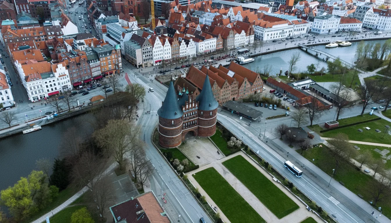 • 🚶 Walk across the 🌉 bridge toward the historic Lübeck Old Town 🏰