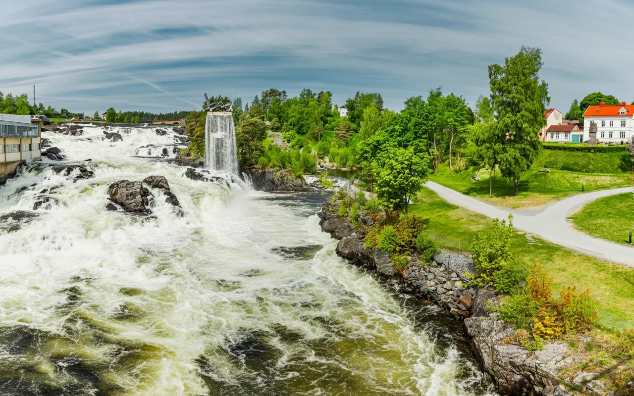 Hønefossen Waterfall is the most recognizable natural landmark in the town of Hønefoss. Located in the center of town, the waterfall is formed by the Begna River as it flows through the urban area, creating a powerful and scenic display of water throughout the year. The waterfall has played an important role in the town’s history, particularly in industrial development and settlement. Today, it serves as a visual focal point and a pleasant place for short walks and photography. For travelers, Hønefossen Waterfall offers an easy and rewarding stop that combines natural beauty with the town’s everyday life.