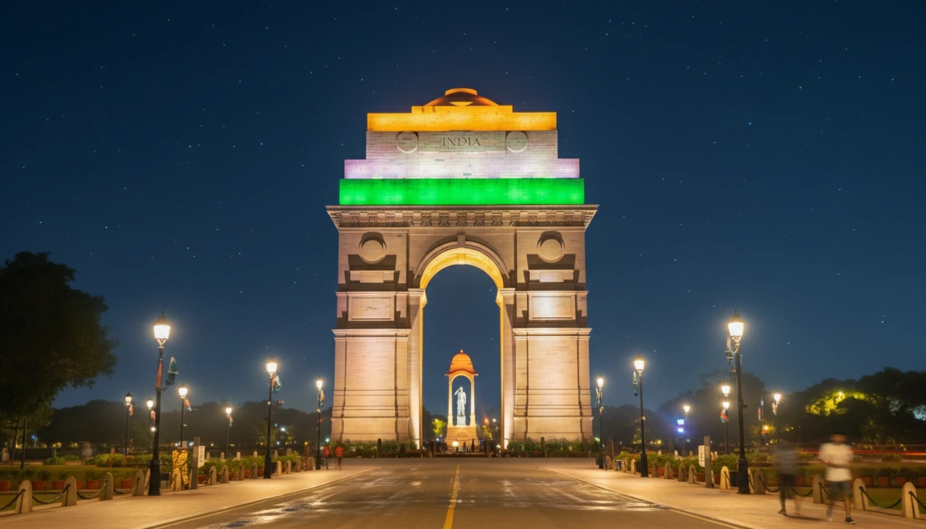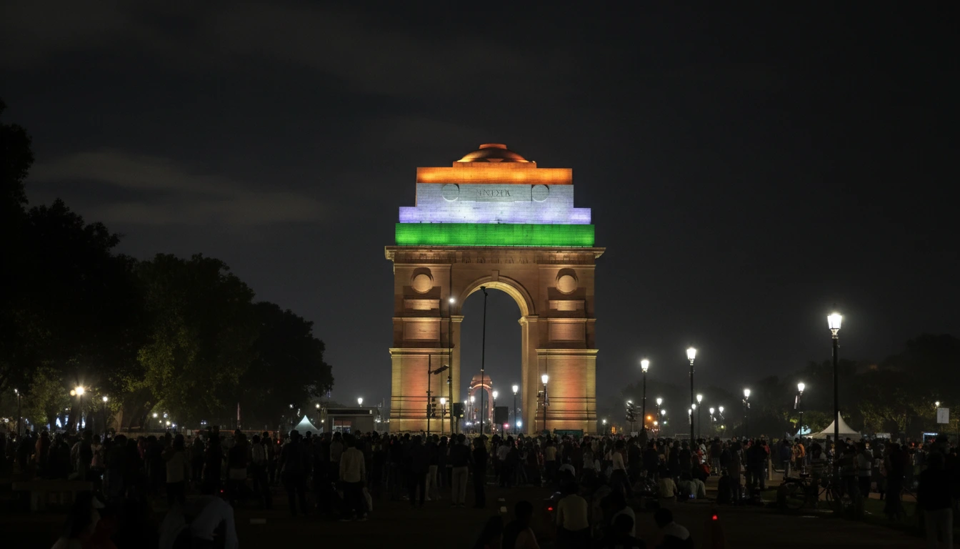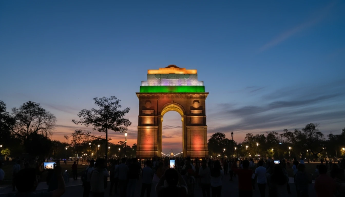 Surrounded by wide ceremonial roads and open green lawns, India Gate serves as both a national