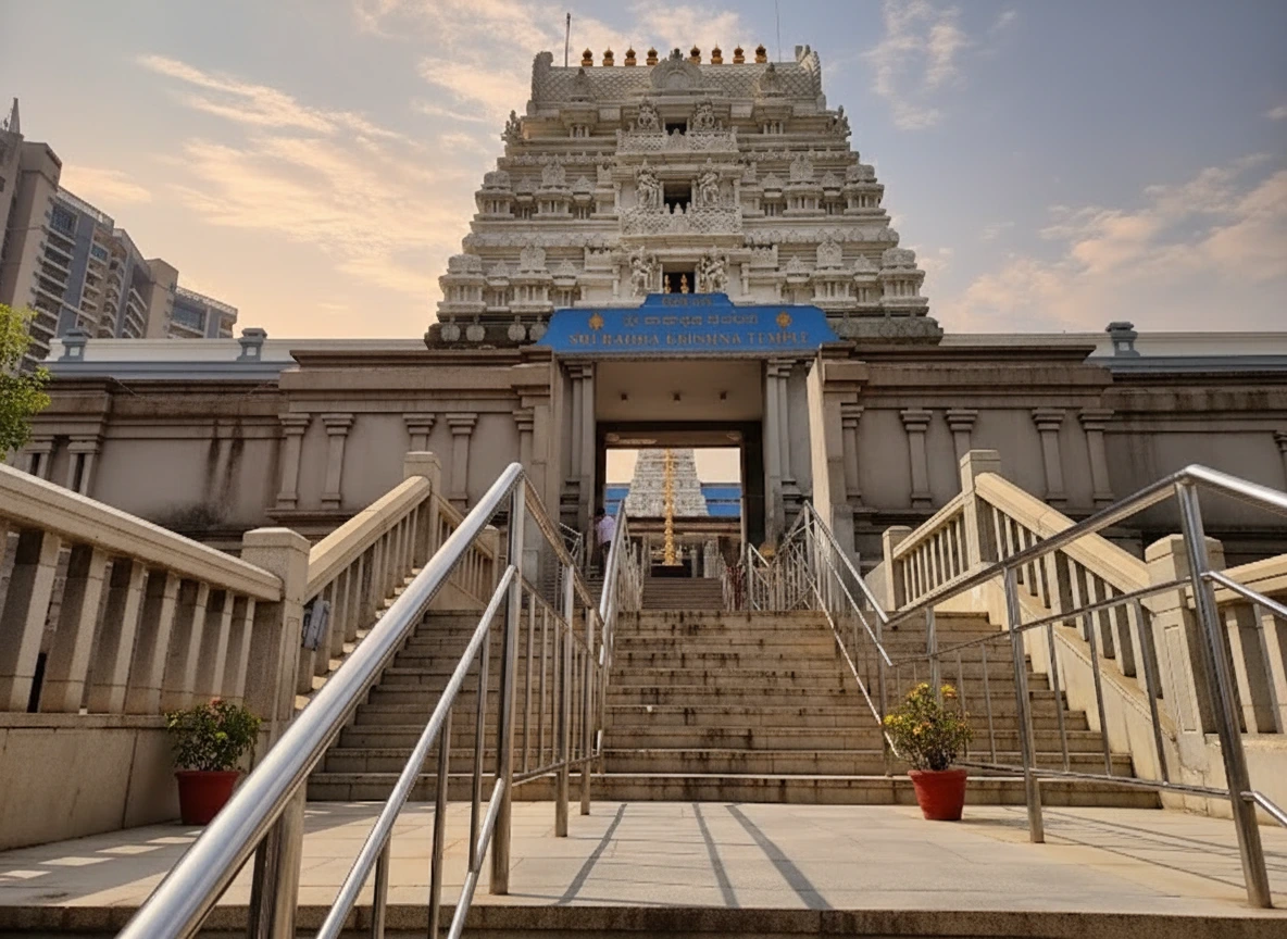 📌• ISKCON Temple, Hare Krishna Hill, Rajajinagar, Bengaluru, Karnataka, India • Located near the city center and major residential areas