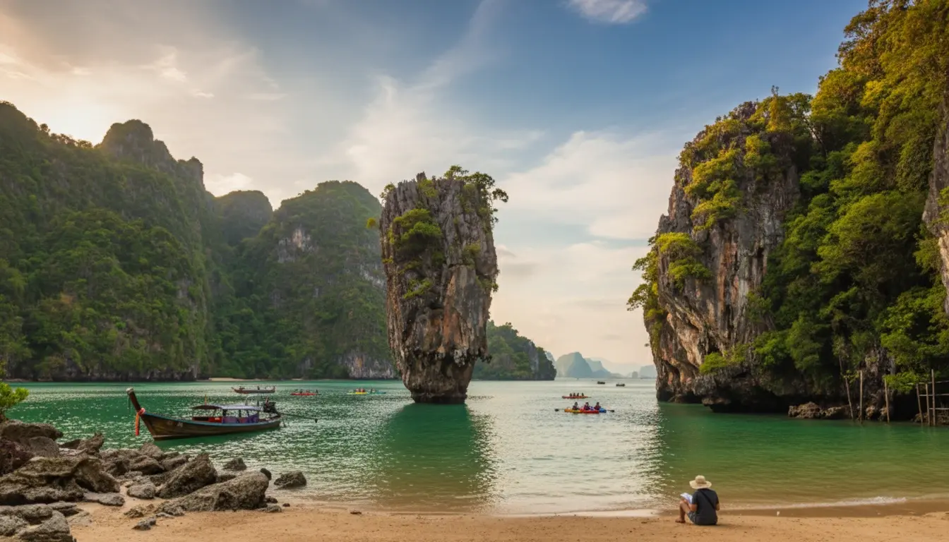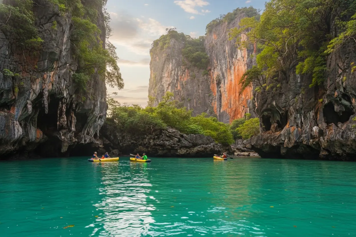 • 9:30 AM – Arrive ⚓ at Phang Nga Bay 🌊 and begin sea canoeing 🛶🚣‍♂️