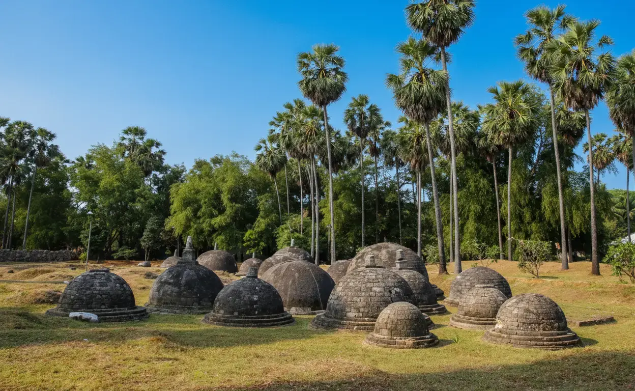 • Ancient Coral Stupas ⚪🙏: Walk among the 60+ stone domes 🗿, each believed to enshrine sacred relics 💎📜