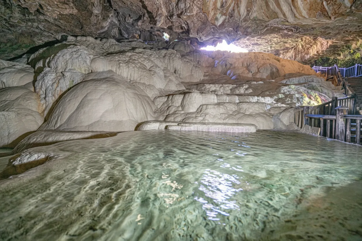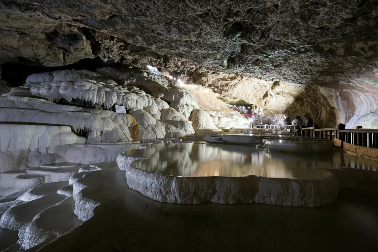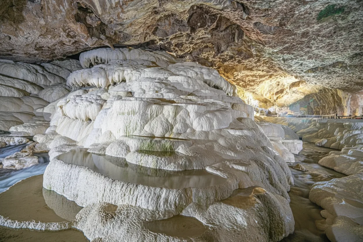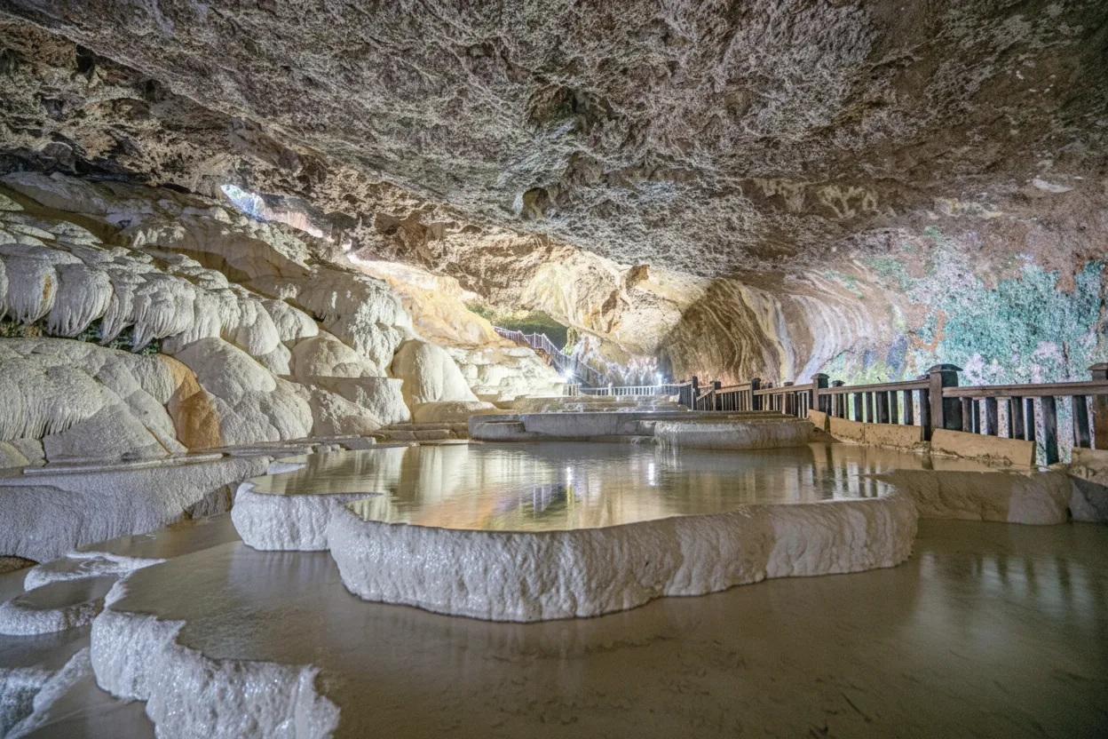 Kaklik Cave is a natural underground cave near Denizli, often described as an indoor version of Pamukkale. The cave features warm thermal water, mineral formations, and smalldunique limestone structures formed over centuries. Visitors can explore wooden walkways inside the cave and experience a cool, humid atmosphere.