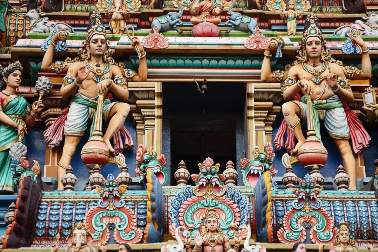 the temple features a colorful gopuram, intricately carved pillars, and spacious