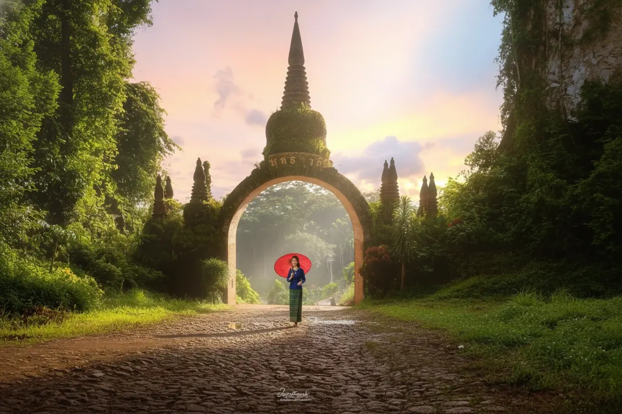 • 7:00 AM – Walk 🚶‍♂️ through the archways ⛩️ and take photos 📸 of the misty pagodas 🌫️✨