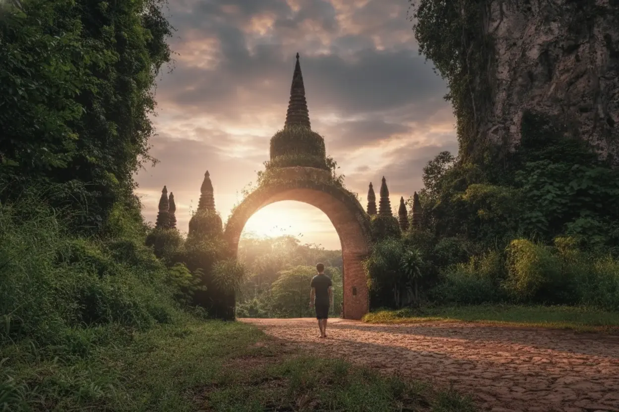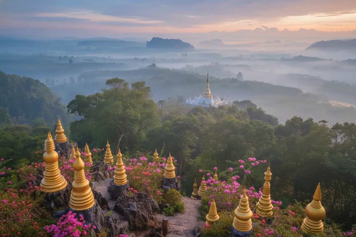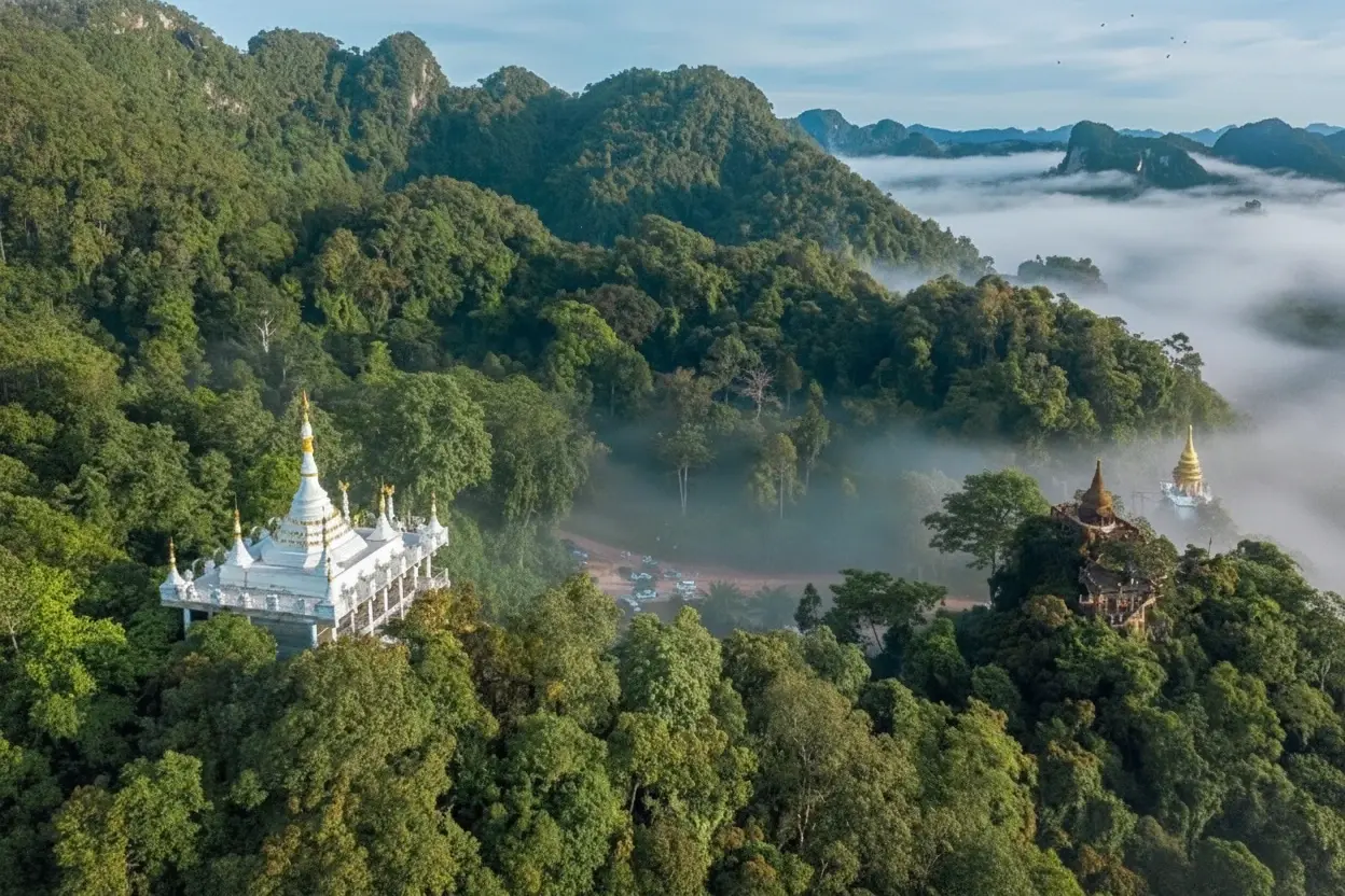 Khao Na Nai Luang Dharma Park is one of southern Thailand’s most breathtaking spiritual sites, located in Surat Thani Province. Surrounded by misty mountains and lush forests, this temple complex features arched gateways, golden pagodas, and meditation caves. It’s a peaceful retreat for those seeking beauty, calmness, and reflection amid nature.