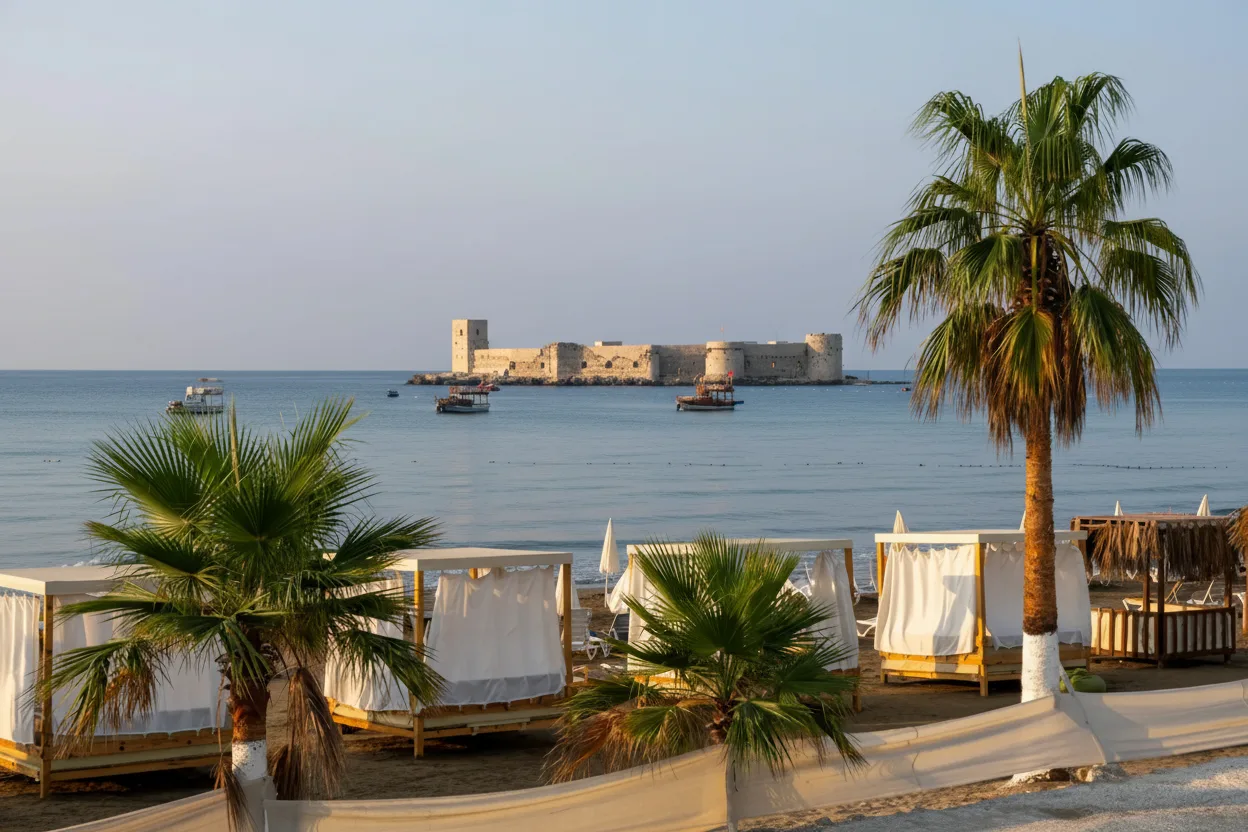 Kizkalesi Beach is a popular seaside area known for its calm Mediterranean waters and soft sandy shore. With clear views of the offshore Kizkalesi Castle, the beach is ideal for swimming, relaxing, and family visits.