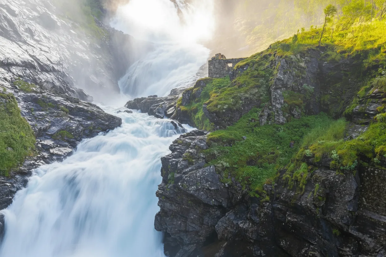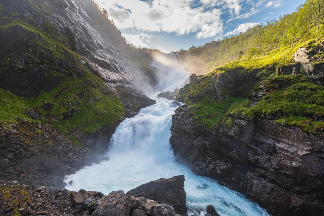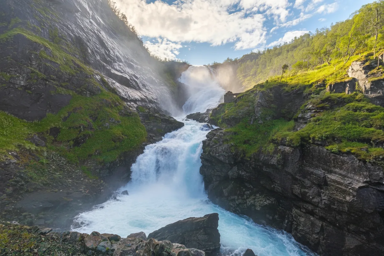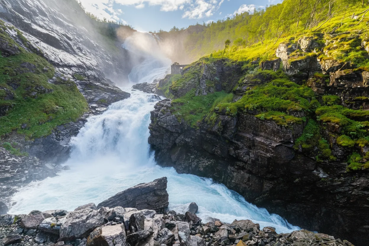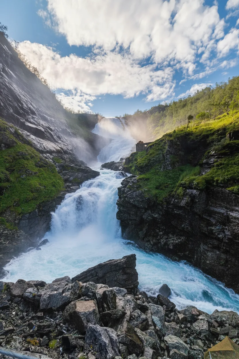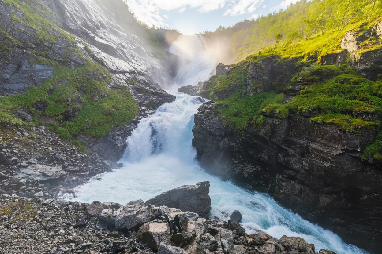 • 09:45 – Arrive at the Kjosfossen stop as the train pulls onto the mountain bridge 📍