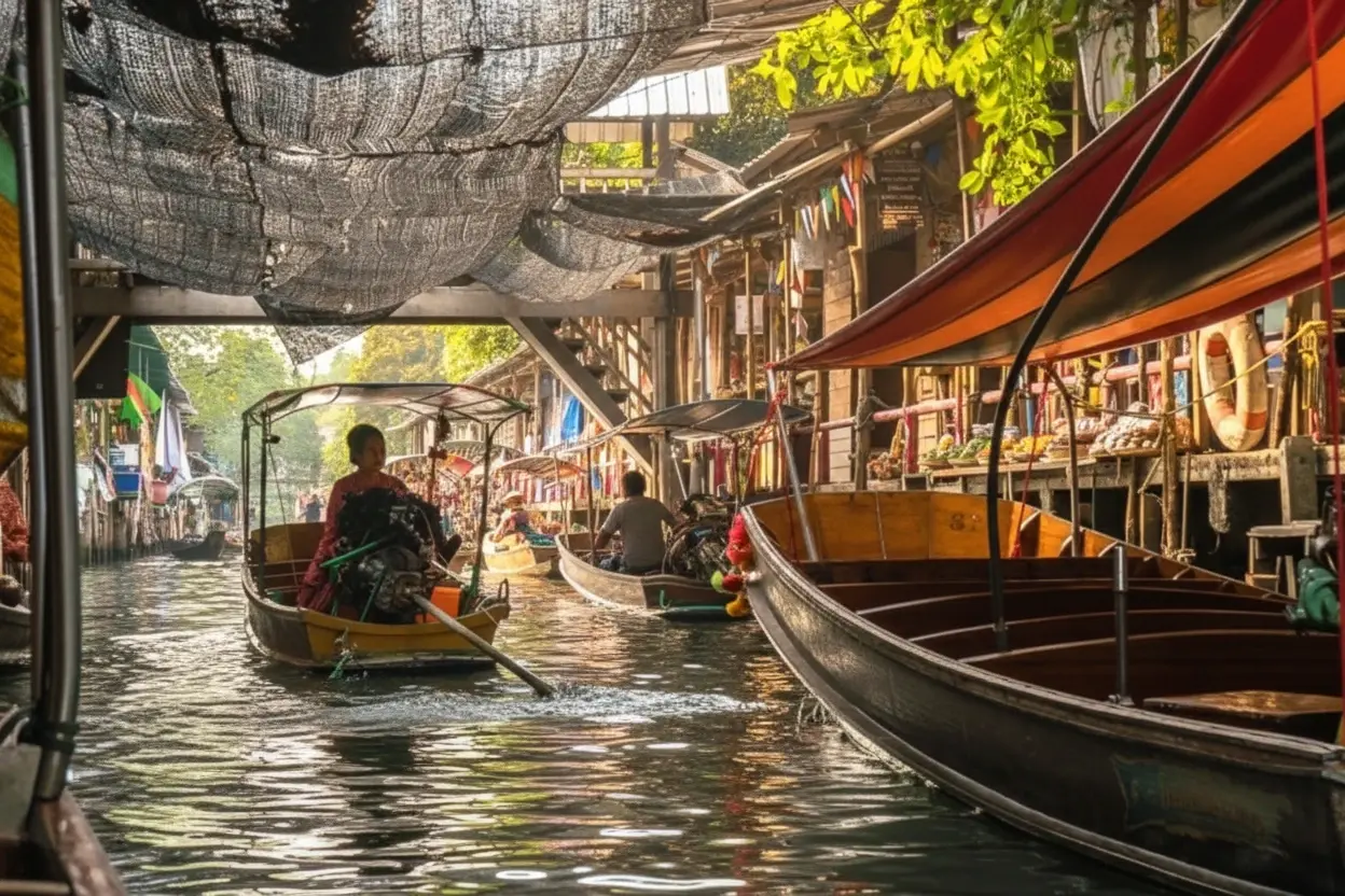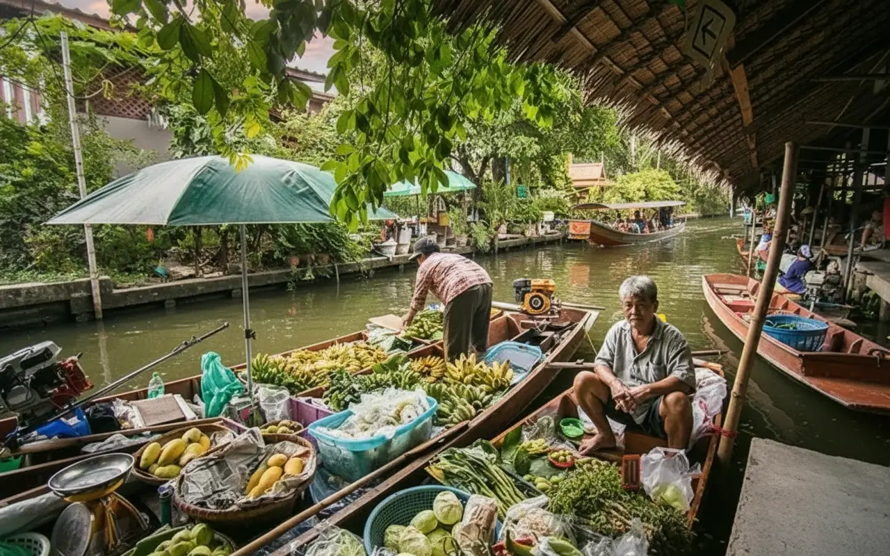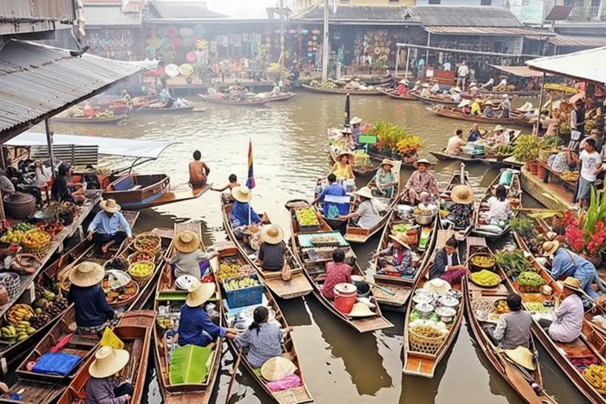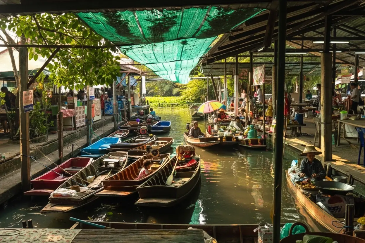 • 9:00 AM – Arrive 🧭 at Klong Sam Floating Market 🛶 and explore the stalls 🛍️🛒💨