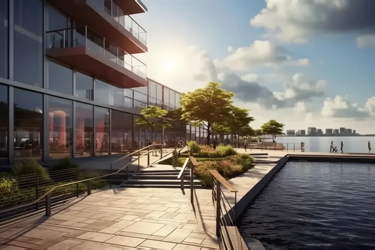peaceful scenery with contemporary public spaces. Located beside calm lake
