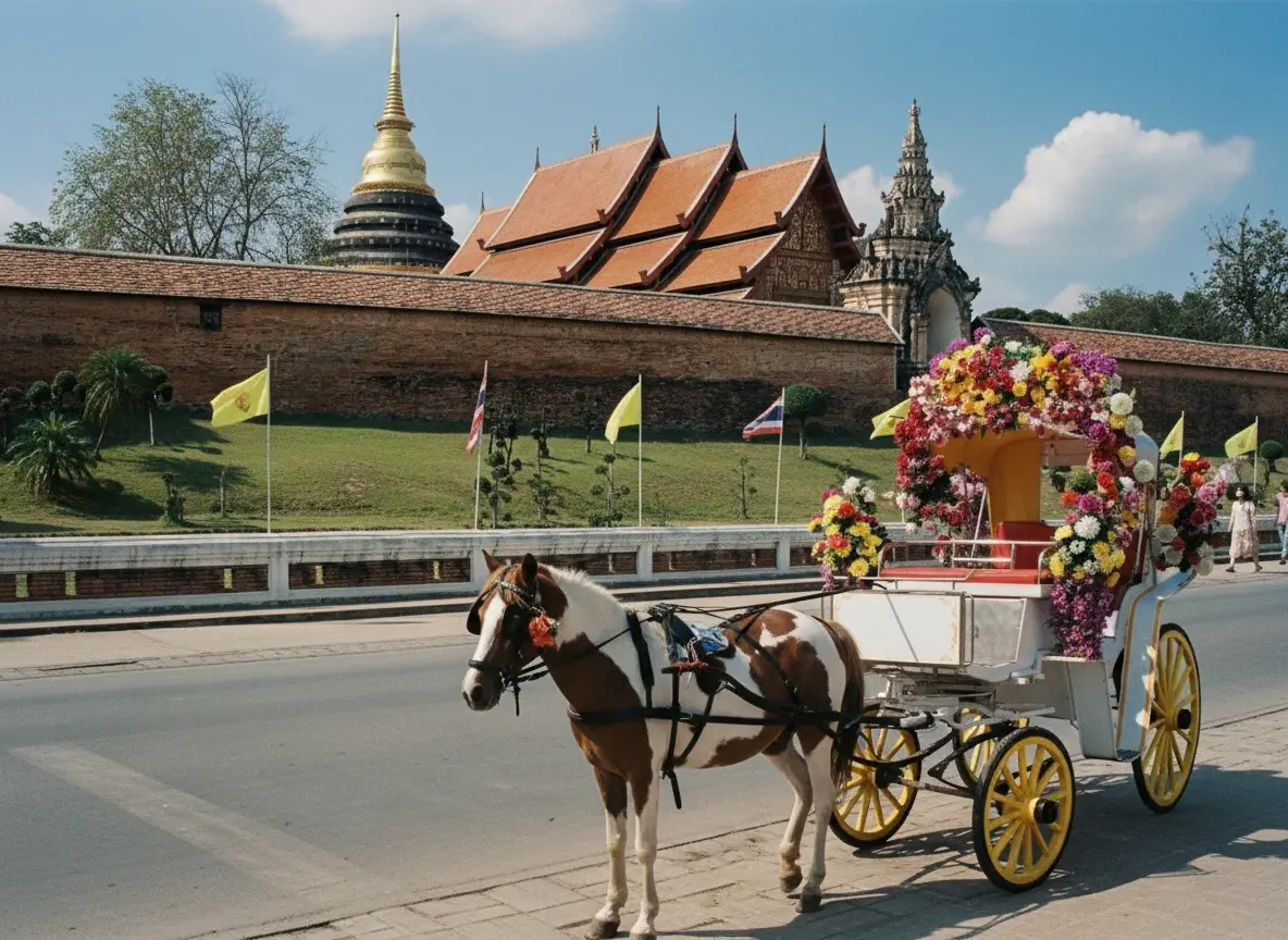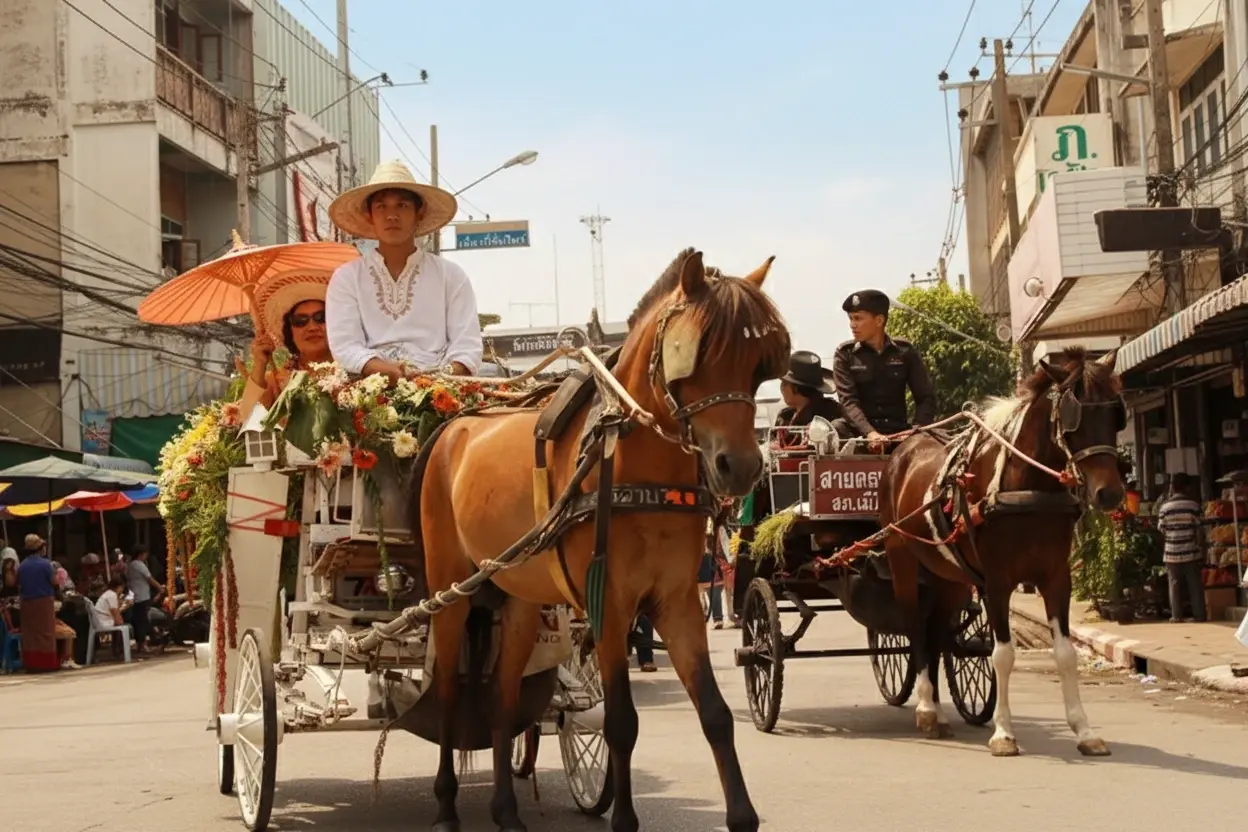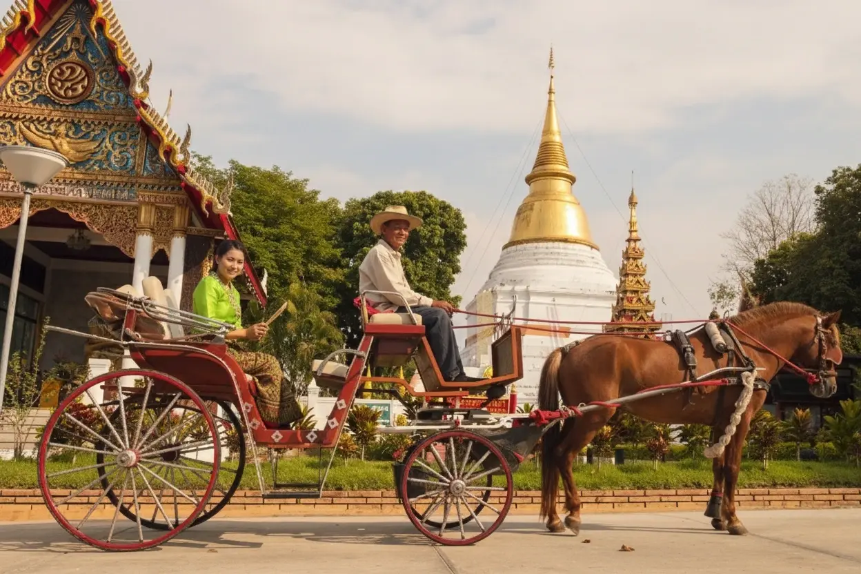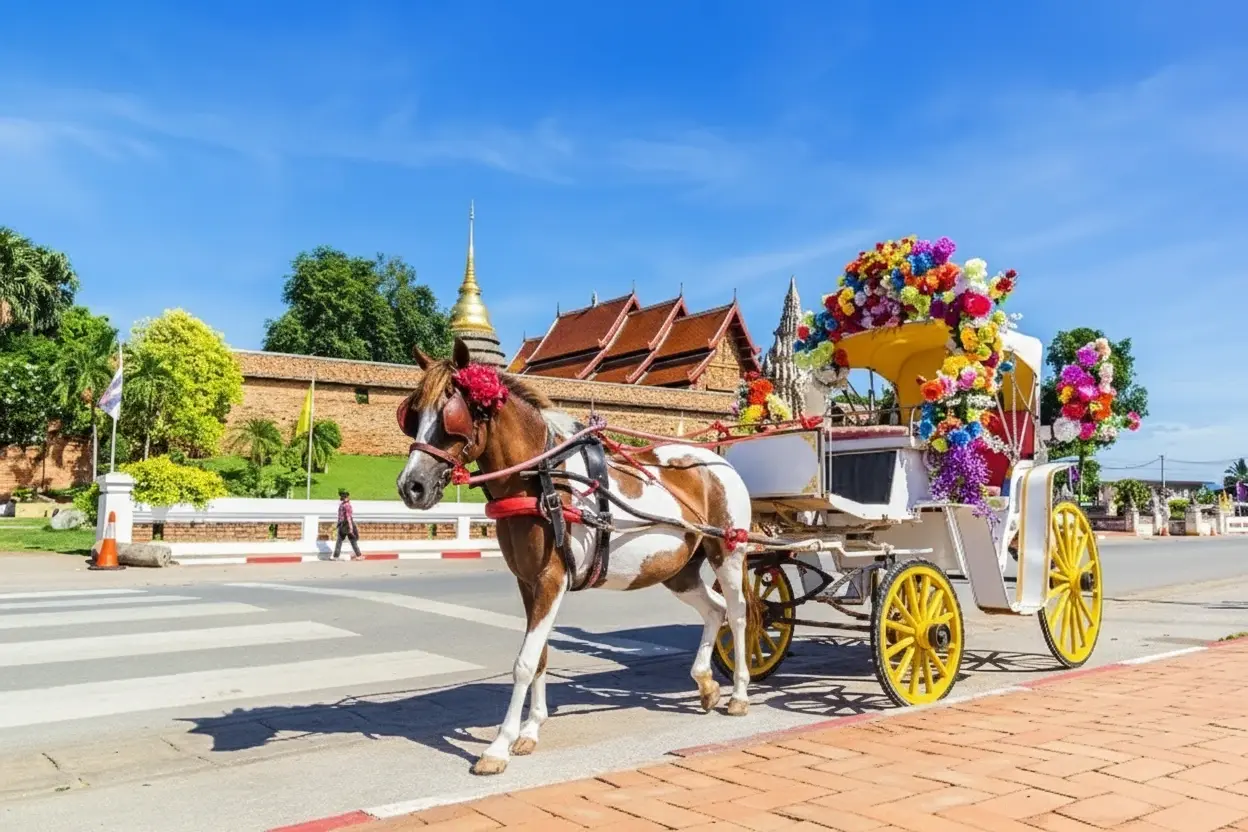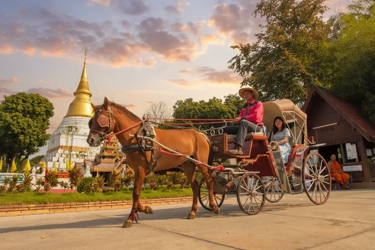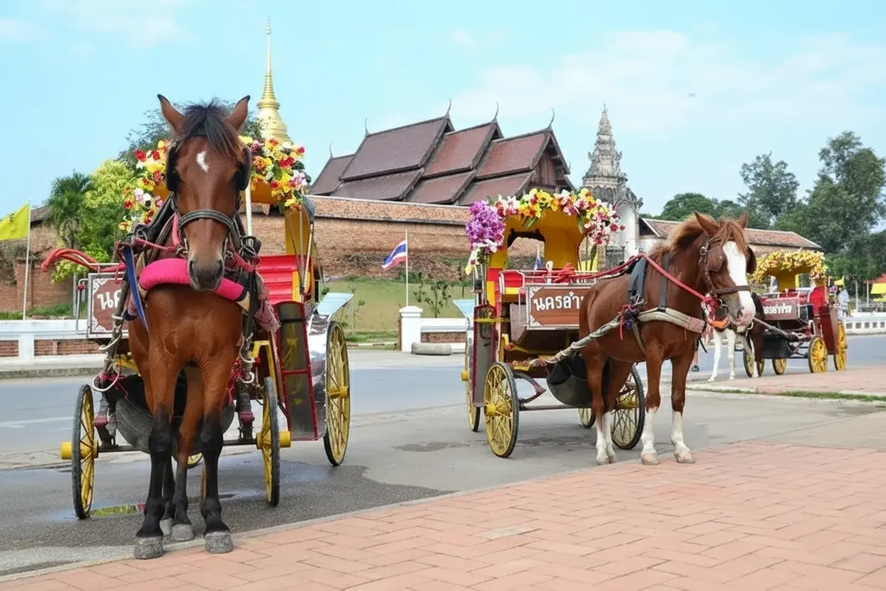 The Lampang Horse Carriage Ride is one of the most iconic ways to explore the city’s old-world charm. Dating back to the early 20th century, horse-drawn carriages were once the main mode of transport in Lampang. Today, they are a symbol of the city’s cultural identity and offer visitors a relaxing journey through heritage streets, temples, and markets.
