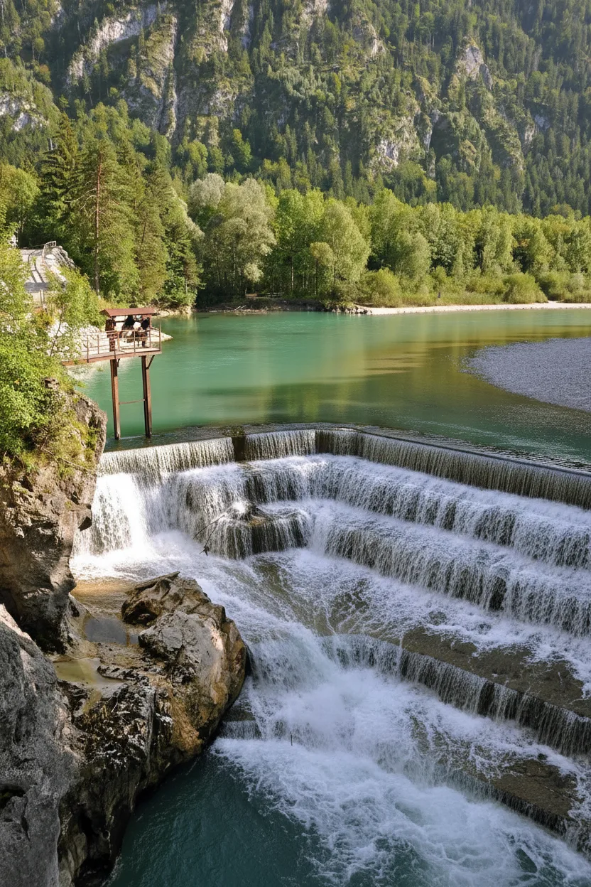 Lechfall, located just outside Füssen in Bavaria, is a striking man‑made waterfall on the Lech River. With turquoise water, dramatic cliffs, and panoramic viewpoints, it is one of the region’s most scenic natural stops. Travelers visit for photography, short walks, and views of the roaring cascade.