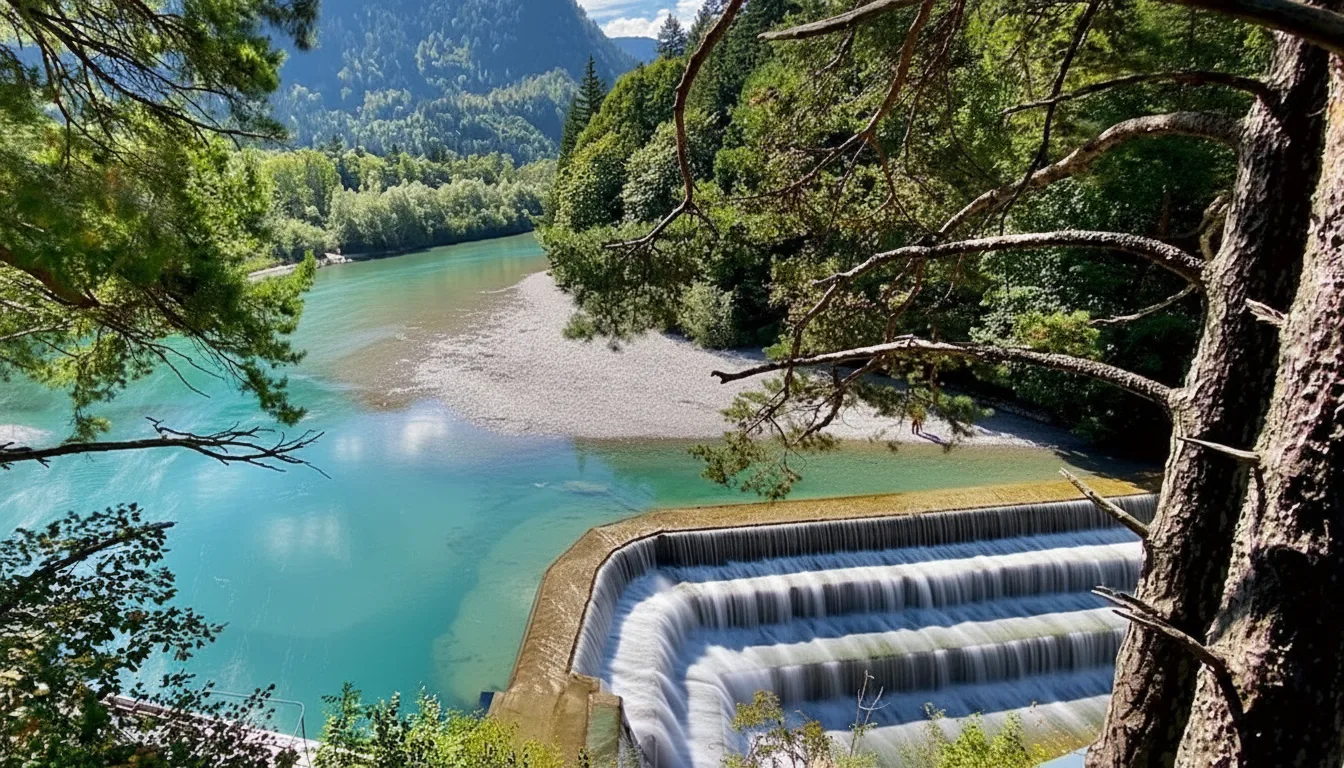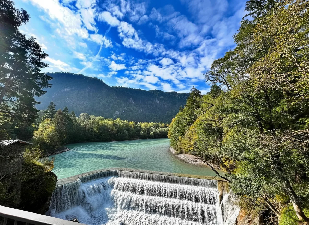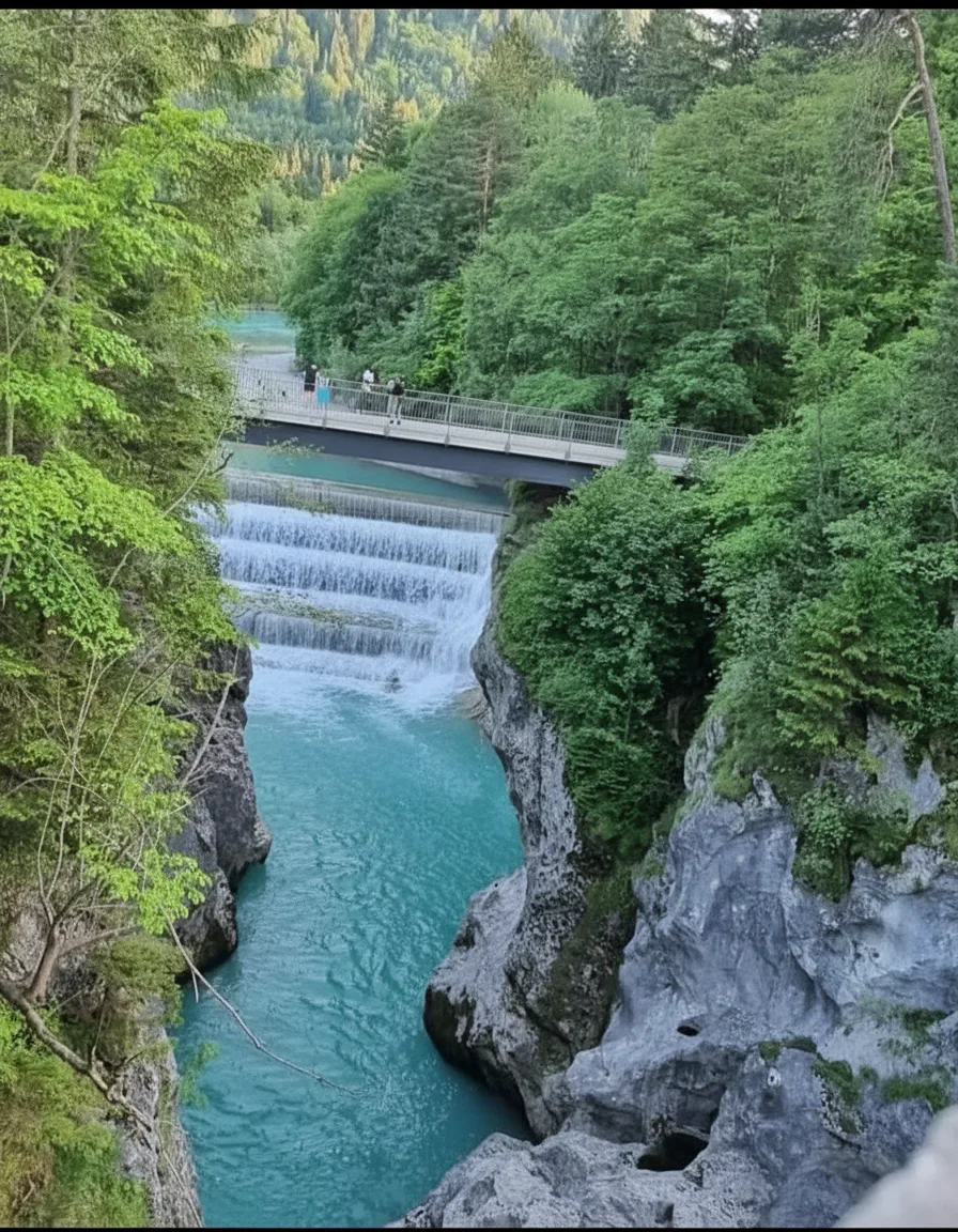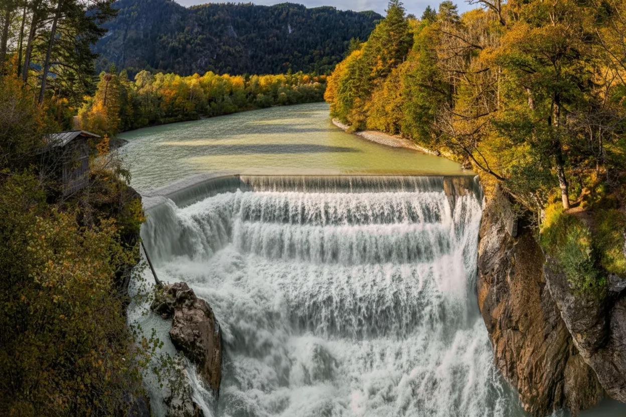 Lechfall is a dramatic man‑made waterfall located at the edge of Füssen. It marks the point where the turquoise River Lech rushes through a narrow rocky gorge known as Lechschlucht. The viewpoint offers powerful water views, rugged cliff scenery, and historic bridges — making it a must-see stop near Füssen Old Town.