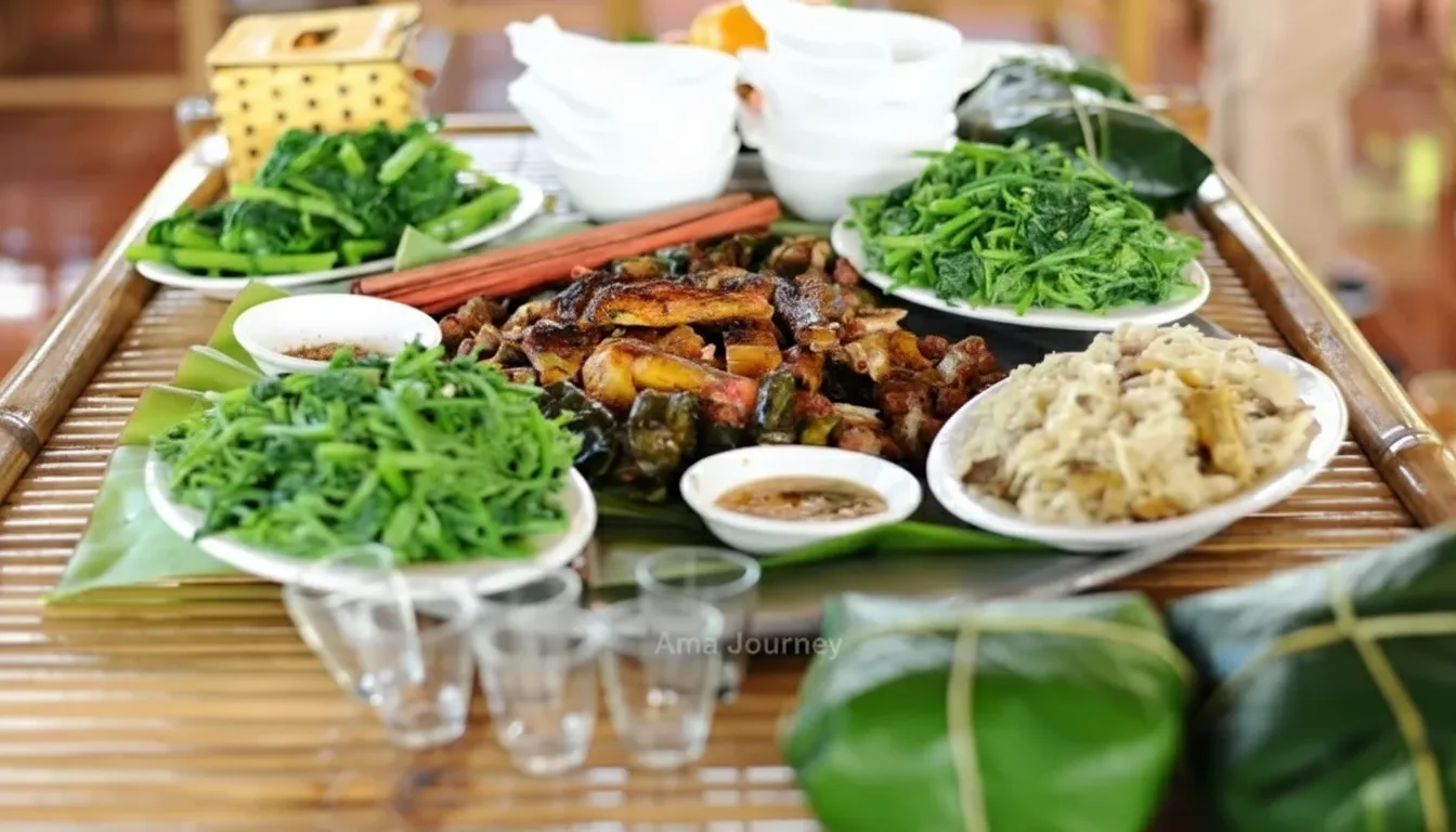 • 🍱 Enjoy traditional 🥢 countryside meals served on communal bamboo trays 🎋