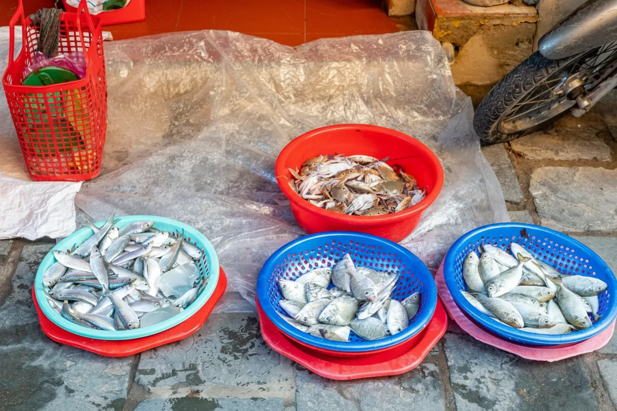 fishermen selling fresh catches, locals shopping for ingredients, and small vendors offering