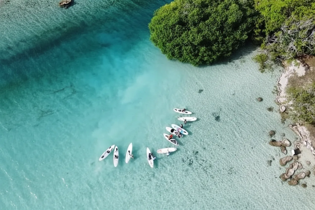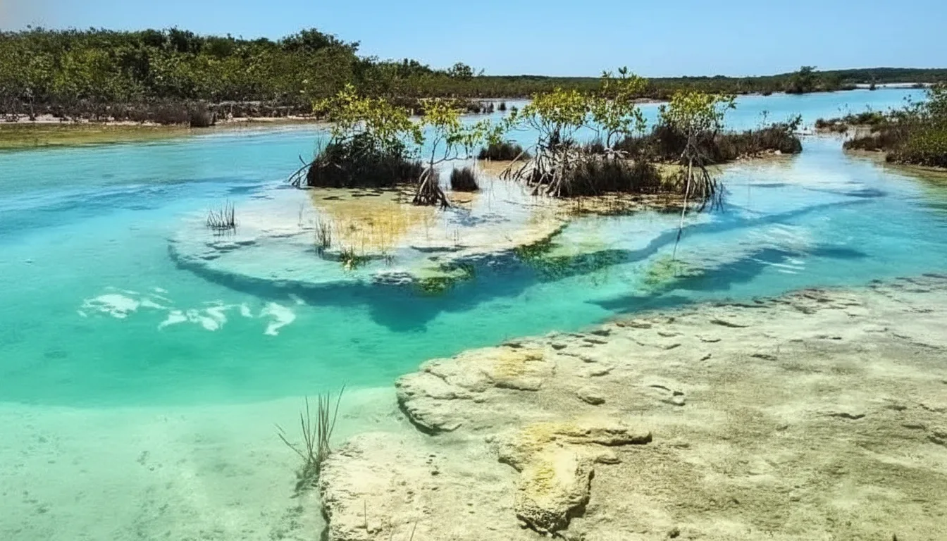 Los Rápidos is a unique natural water channel located near Bacalar Lagoon. This area is known for its gentle flowing water that connects different parts of the lagoon system. The movement of the water creates a refreshing and relaxing swimming experience. The site is popular for floating, swimming, and enjoying the surrounding greenery. Wooden walkways and resting areas allow visitors to relax while observing the clear water below.